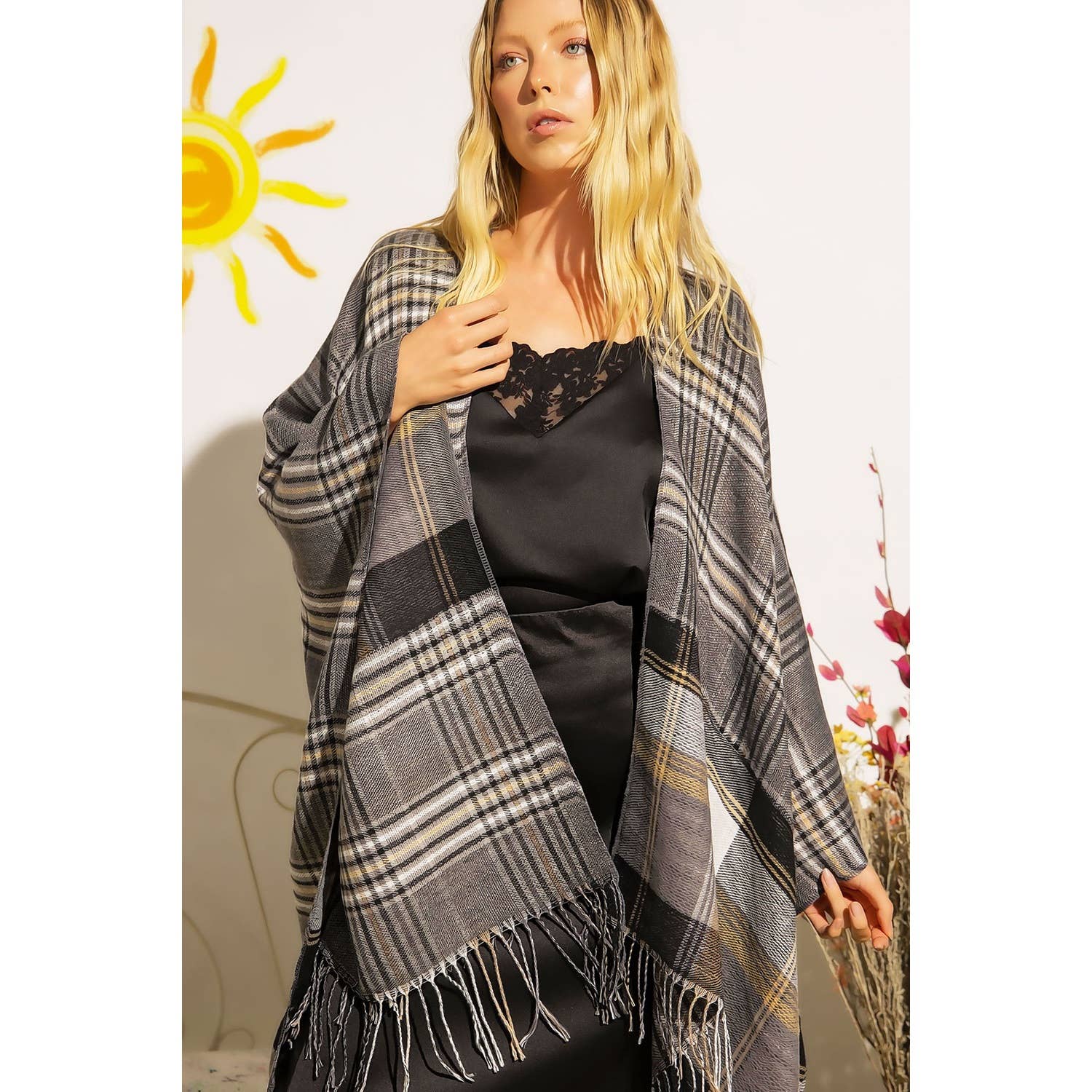 Charme campagnard rustique. L'aspect naturel nubby de la toile de jute associé à la douceur de la soie est parfait pour l'élégance automnale. Les boutons en bois apportent la touche finale à un look inoubliable. Ce foulard/châle se transforme en un poncho souple parfait pour une polyvalence totale. Impression numérique sur tissu synthétique Laver à la main/sécher à plat Importé