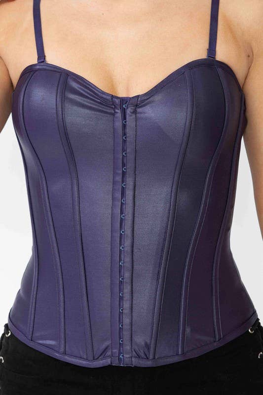 * Corset complet en satin de polyester noir de haute qualité * Fermeture éclair avant haut de gamme * Top licou à nouer derrière le cou * 10 os en plastique avec 4 os dorsaux en acier statique * Œillets en laiton nickelé avec cordon épais à l'arrière pour le serrage * Panneau de confidentialité à l'arrière * Passants pour jarretières * Nettoyage à sec uniquement