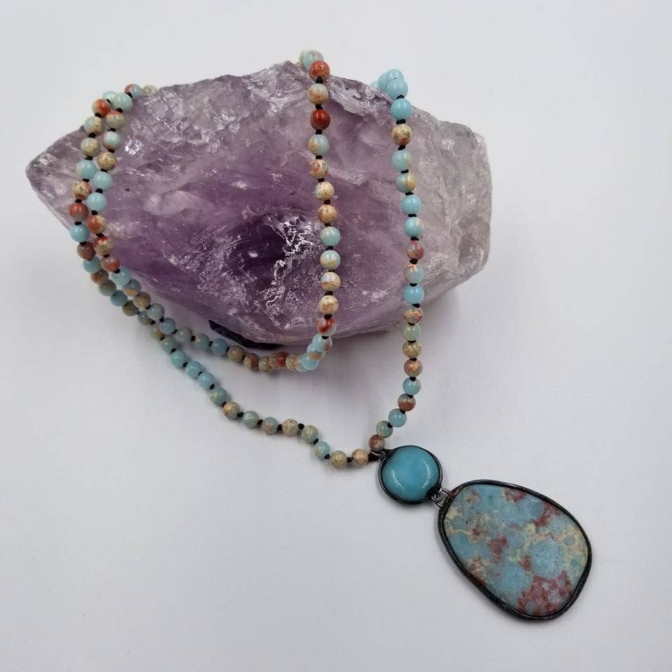 Collier court ajustable en perles de pierre avec grand pendentif en pierre. Longueur de 11 pouces.