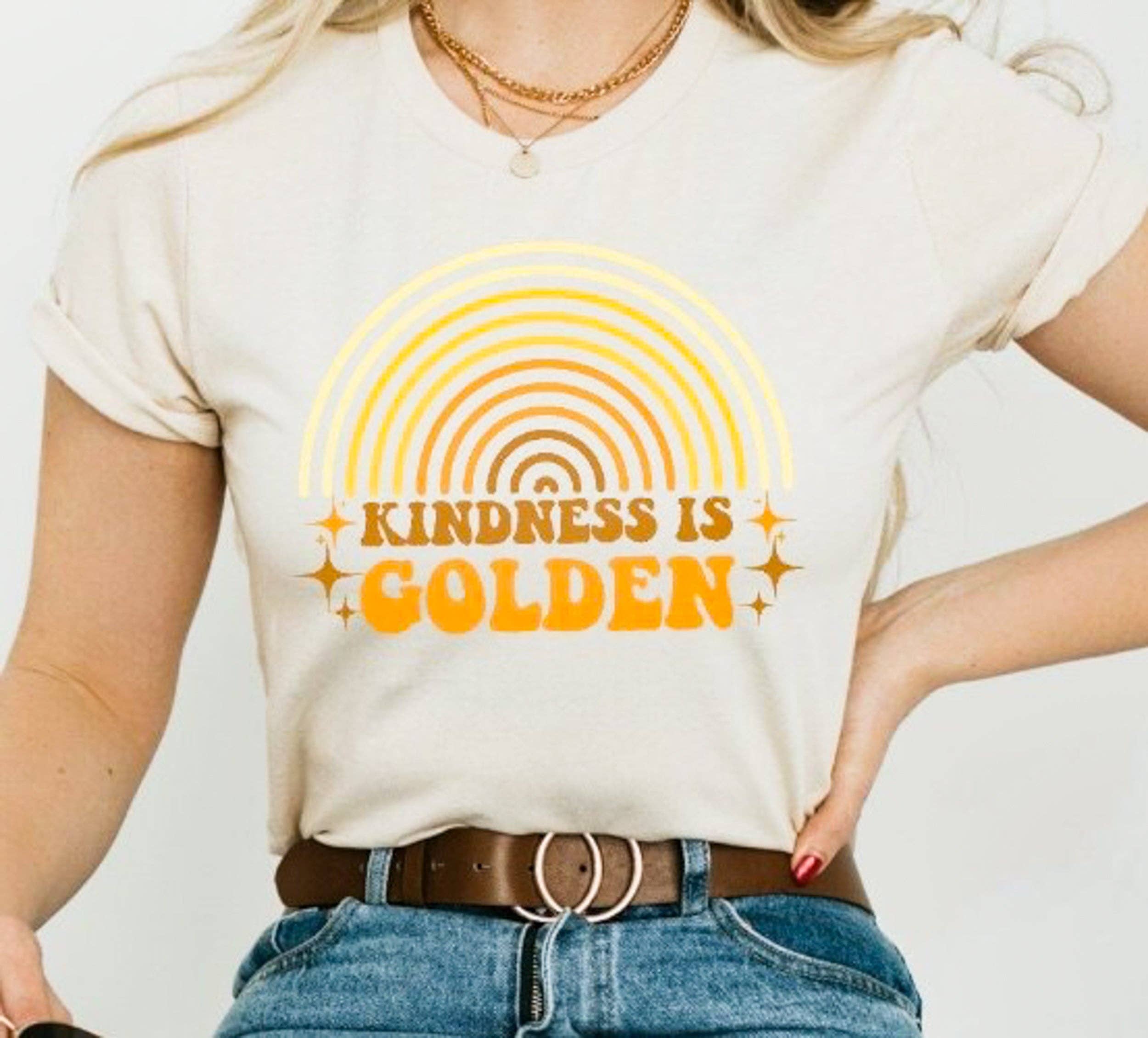 T-shirt graphique KINDNESS IS GOLDEN -100 % coton pour des couleurs unies 52 % coton/48 % polyester pour Heather -Coupe décontractée unisexe -Sérigraphié à la main. -Fabriqué sur commande.
