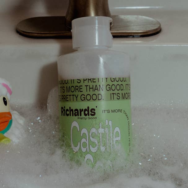 Nous pensons que le savon de Castille n'a pas besoin d'être présenté, mais nous allons quand même vous en donner une. Notre savon de Castille est votre savon polyvalent, à l'ancienne, qui fait tout. Vous pouvez l'utiliser tel quel ou dilué selon vos préférences. Utilisez-le sur votre corps, sur vos mains, dans votre lessive, pour nettoyer les dégâts, ou même sur votre animal de compagnie (testez toujours sur une petite zone pour commencer). Vous avez déjà entendu parler de tous les autres usages par la grande marque, donc nous pensons que nous n'avons pas besoin de nous expliquer davantage... Alors, qu'est-ce qui rend le nôtre digne du nom Richards' Pretty Good ? Eh bien, tandis que d'autres continuent de réduire les coûts et de remplacer ce que nous considérons comme les meilleurs ingrédients par des moins chers (nous parlons de vous, huile de palme), nous l'avons gardé avec un mélange assez bon d'huiles d'olive et de noix de coco pour que votre peau se sente bien. Pour couronner le tout, nous gardons tout d'origine naturelle, sans couleurs artificielles, et adapté aux personnes allergiques.