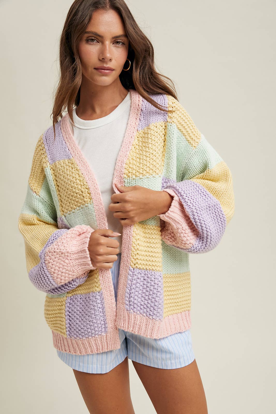 Ce cardigan en maille douce présente un motif colorblock pastel en rose, lilas et jaune beurre. Un col en V flatteur rencontre trois boutons étincelants avec des détails en cristal pour une touche de brillance. Les manches longues se terminent par des poignets à volants ludiques, tandis que la silhouette décontractée se drape sans effort sur le corps. À associer avec des jeans ou des jupes pour un look féminin et fantaisiste. Matériau : 100 % polyester