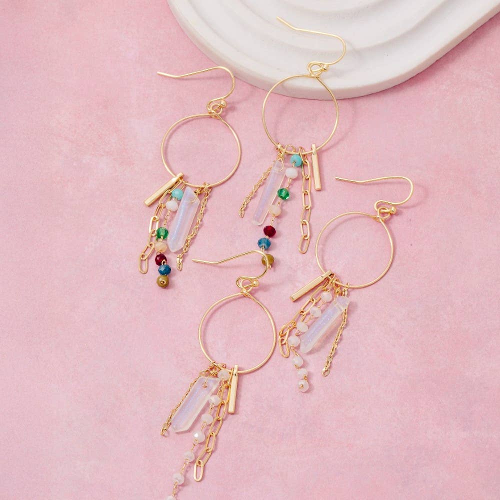 Boucles d'oreilles à breloques Rhea Mix Ces boucles d'oreilles à breloques colorées faites à la main sont fabriquées avec un mélange de verre tchèque, de pierres précieuses et de perles de nacre. Portez-les en paire pour un look amusant, ou choisissez le même style pour les deux boucles d'oreilles ! Les breloques se retirent facilement, vous pouvez donc les échanger et créer différents styles quand vous le souhaitez. Comment passer commande : Voir la deuxième photo pour les options de style. Choisissez votre style préféré pour chaque boucle d'oreille. *Les perles peuvent légèrement varier * Les cerceaux sont en plaqué or 18 carats * Longueur de la chute : 1,5 pouces