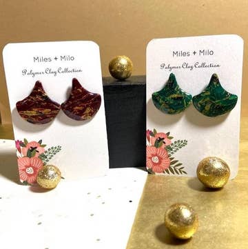 Boucles d’oreilles artisanales en argile polymère, fabriquées en petites séries. Elles sont conçues avec un mélange d’argile, de poudre de mica, de peinture acrylique et de feuilles d’or. Chaque pièce est unique, faite à la main, ce qui signifie que les motifs et les couleurs peuvent varier par rapport aux photos. Tous les métaux utilisés sont sans nickel, plaqués or et hypoallergéniques. Entreprise basée à Austin, TX, appartenant à une femme.