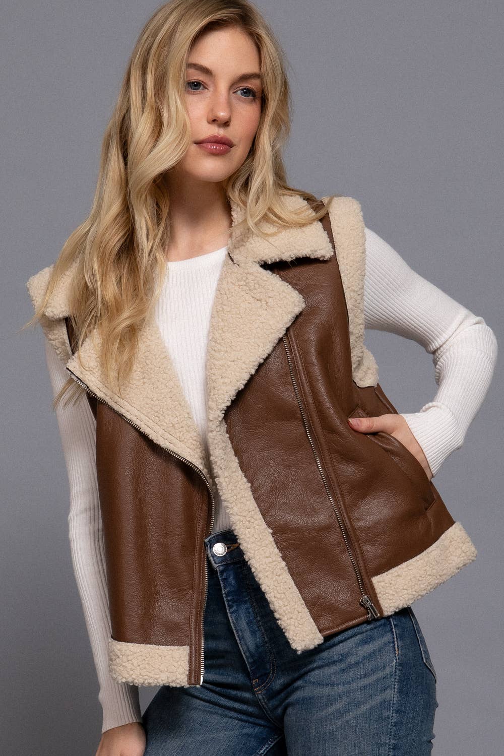 GILET COURT RÉVERSIBLE EN SIMILICUIR-SHERPA AVEC CONTRASTE DE REMBOURRAGE TISSU : SIMILICUIR 100 % POLYURÉTHANE Une étiquette "AVERTISSEMENT PROP. 65" est attachée.