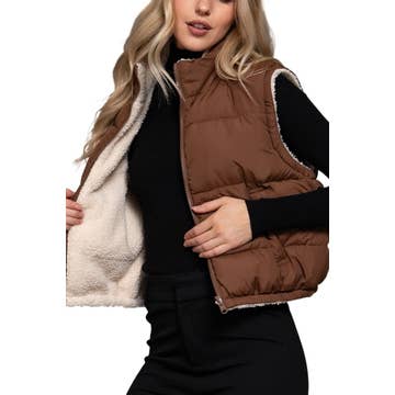 Gilet court réversible en similicuir et sherpa avec rembourrage contrasté en vente B2B