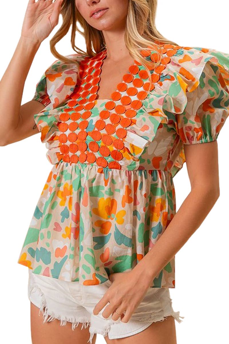 Top à col rond texturé à bulles Manches à bulles Manches courtes