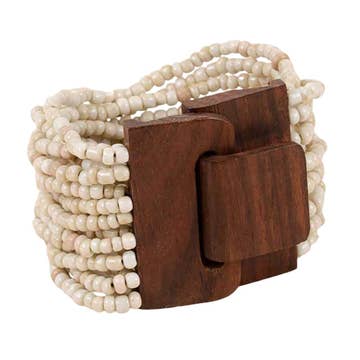 Le bracelet Bali fonctionne bien avec nos ceintures à volutes en bois. Les perles sont bouillies dans une solution de poudre et d'eau pour obtenir la finition vieillie. Il est préférable de simplement tirer sur le bracelet sans ouvrir le fermoir. Montrez au client comment ouvrir le bracelet s'il le souhaite. Il ne se tord pas - casse possible si cela est fait de cette façon.