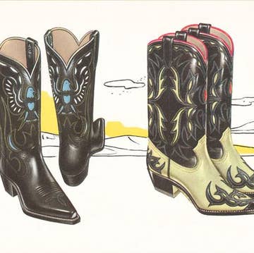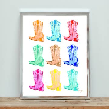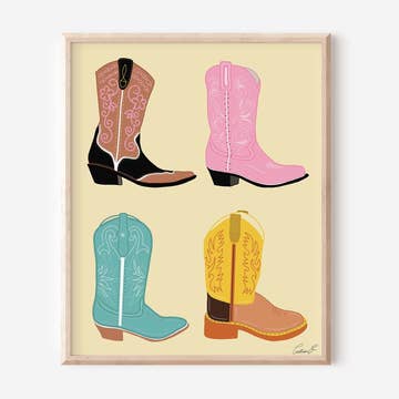 Impression giclée d'art représentant une œuvre d'art de bottes de cow-boy bleues peintes à la main. Idéal pour offrir ou pour la décoration intérieure ! Chaque impression est emballée dans une pochette en plastique transparent avec un support artistique et une carte postale souvenir.