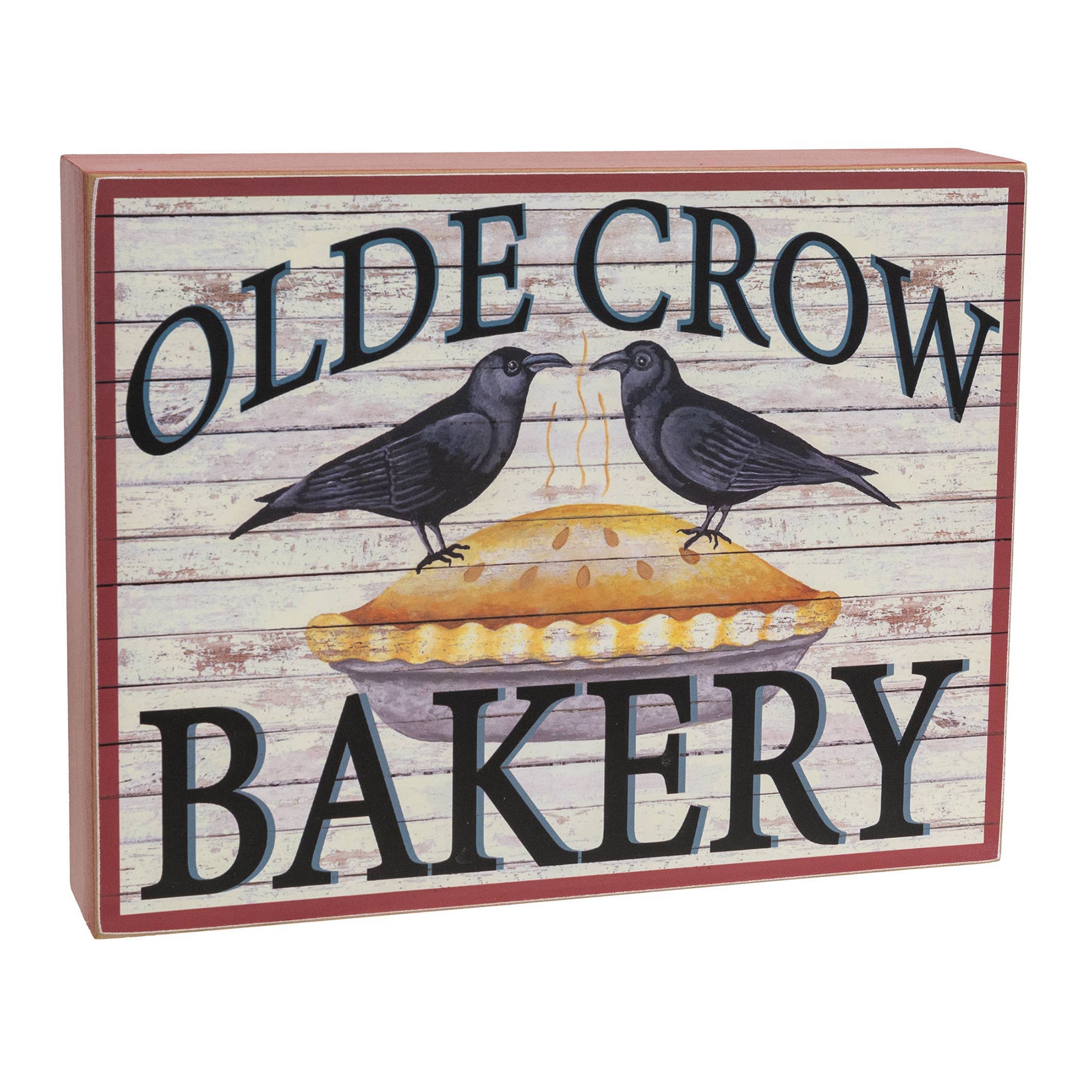 L'enseigne de la boîte de maïs sucré présente une illustration saisonnière d'un corbeau portant un chapeau orné d'un morceau de maïs sucré. Elle complétera une décoration d'automne vintage et la bordure à carreaux ajoute une touche de charme campagnard fait maison. Cette enseigne en bois a des côtés peints, des bords légèrement usés et un dos ouvert. Mesure 9" de haut, 8" de large et 2" de profondeur.
