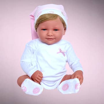 Découvrez Mini Colettos, une gamme variée de poupées pour nouveau-nés anatomiquement correctes, fabriquées artisanalement en Espagne avec soin et attention aux détails. Il a été prouvé que le fait de jouer avec des poupées et des accessoires pour poupées aide les enfants à développer de l'empathie et de la compassion et peut les aider à exercer leur motricité fine. Jedda est une poupée aux cheveux bruns et aux yeux bruns. Détails du produit * Vinyle souple écologique et non toxique (sans phtalates) * Tête et membres mobiles * Fabriqué dans la ville d'Onil à Alicante, Espagne * Anatomiquement correct * Recommandé pour les enfants de 3 ans et plus * Hauteur : 34 cm * Vêtements et sous-vêtements non inclus