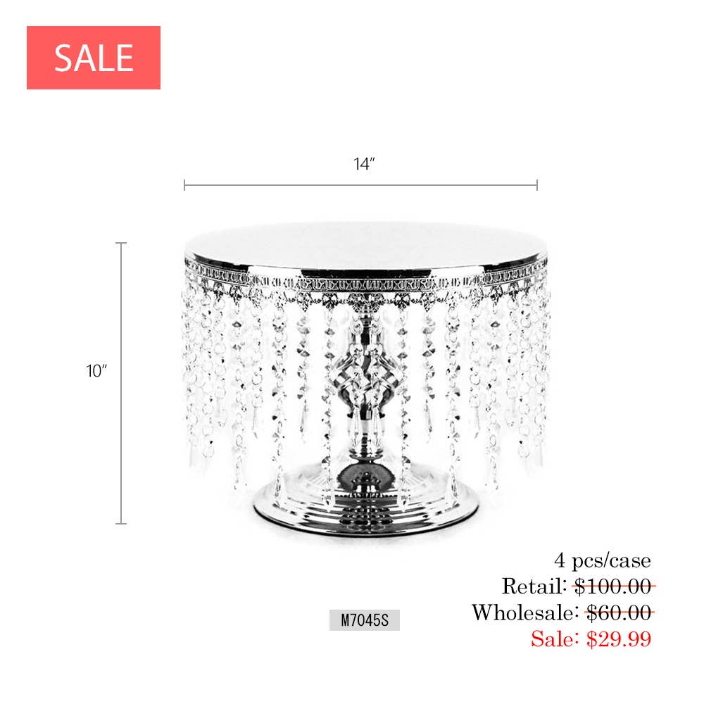 - Présentoir ou support à gâteaux à 2 niveaux en cristal - Pour gâteaux, cupcakes, pâtisseries ou hors-d'œuvre - Comprend des cristaux de qualité supérieure autour de chaque niveau ; le verre miroir recouvre la surface supérieure - Chaque niveau est orné de deux rangées de perles de cristal de qualité supérieure - Disponible en deux couleurs : Or (épuisé) et Argent - Taille : Hauteur = 14" | Diamètre du niveau supérieur = 10" | Diamètre du niveau inférieur = 16" Ce présentoir à gâteaux décoré de cristaux éblouissants expose luxueusement gâteaux et petits plats lors d'occasions somptueuses.