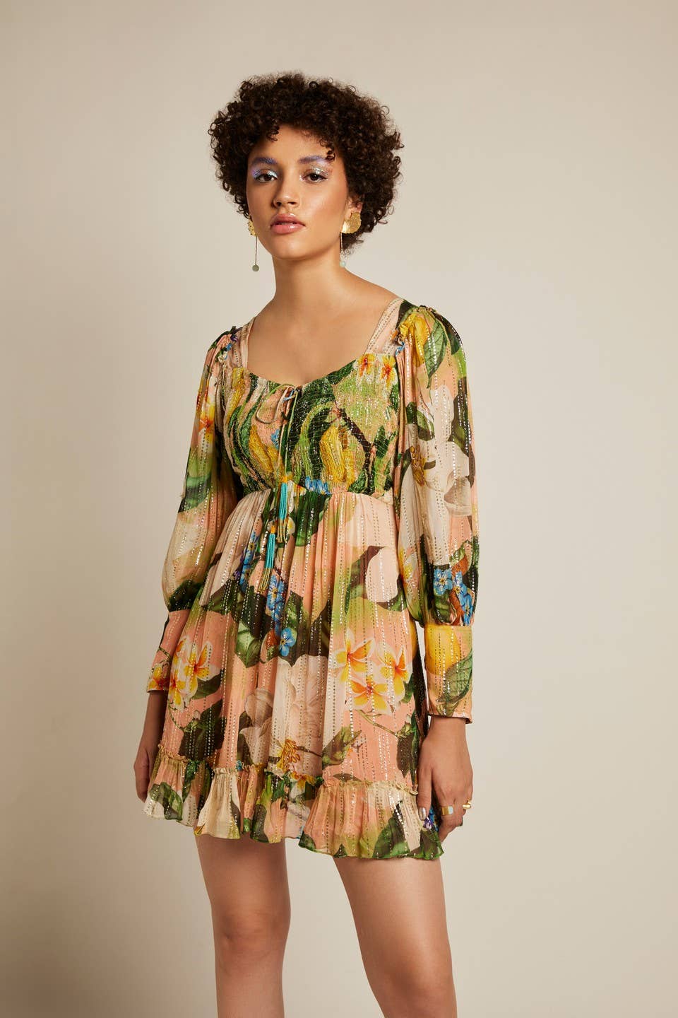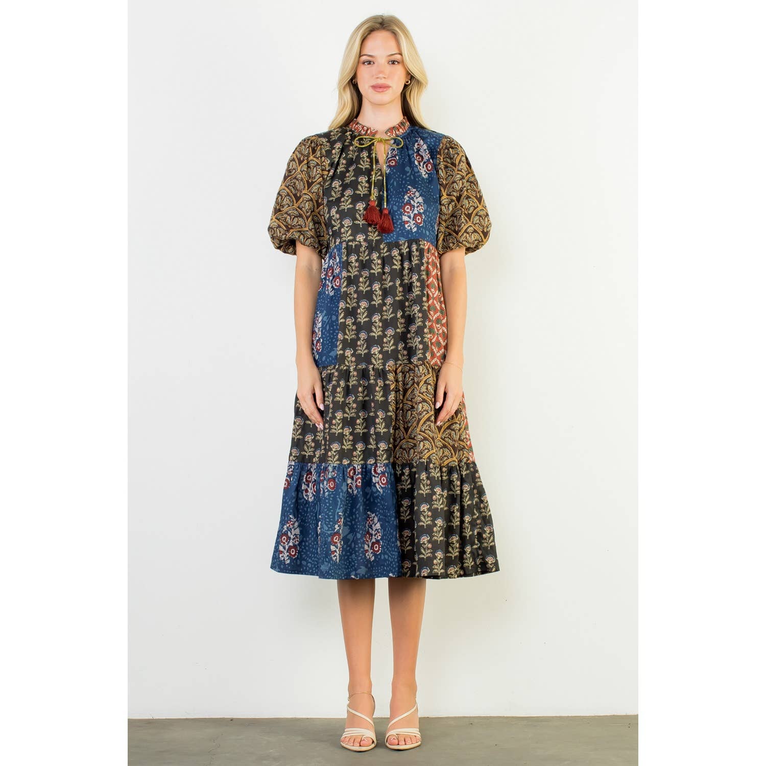 Cette robe mi-longue à carreaux noirs et beiges présente des empiècements color block ainsi que des détails à volants sur l’empiècement et les manches, lui conférant un charme vintage et romantique. Un mélange harmonieux de modernité et de classicisme, parfaite pour apporter une touche d’élégance à toutes les occasions.