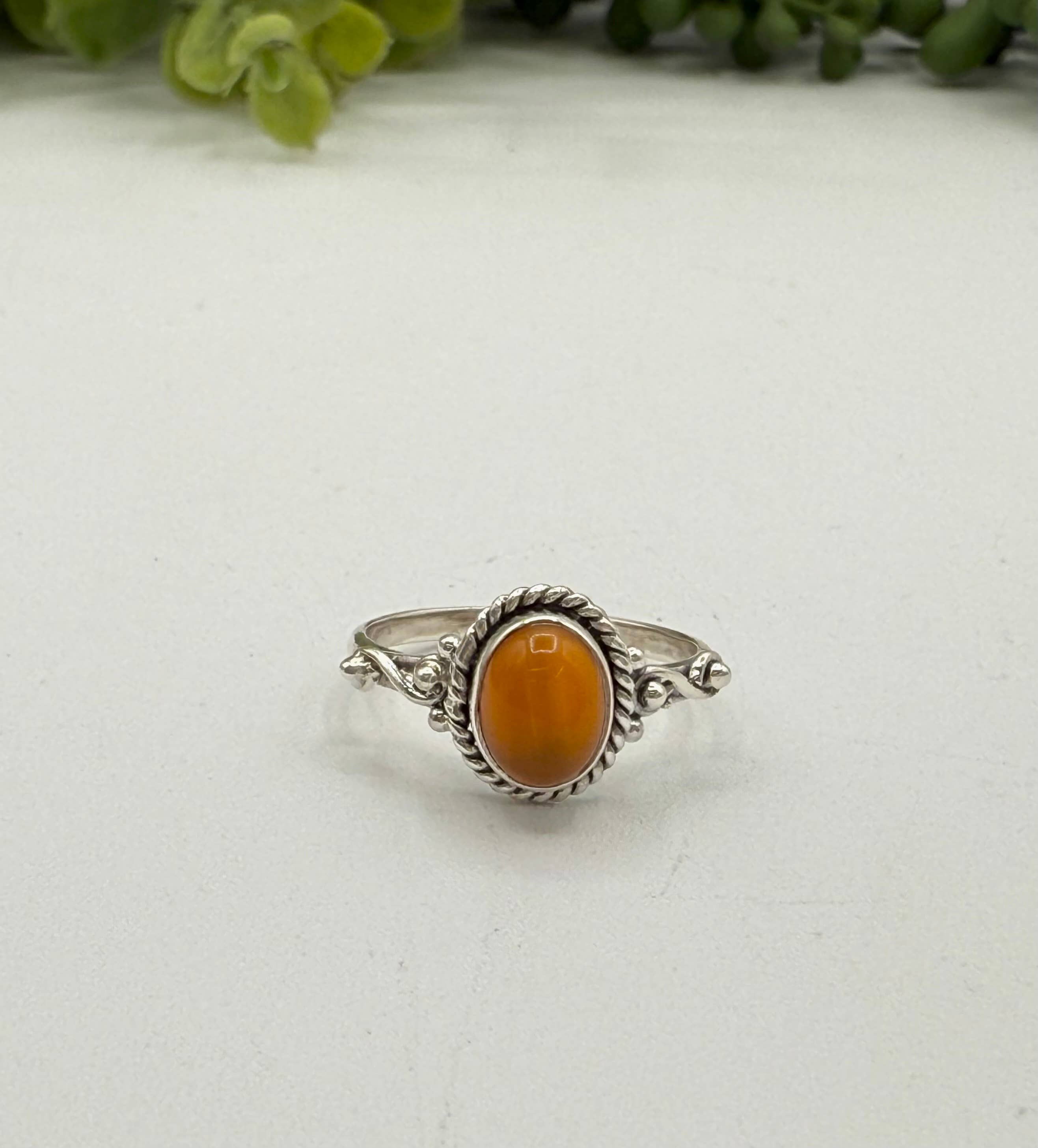 Bague à motif de feuille d'argent ambré cognac