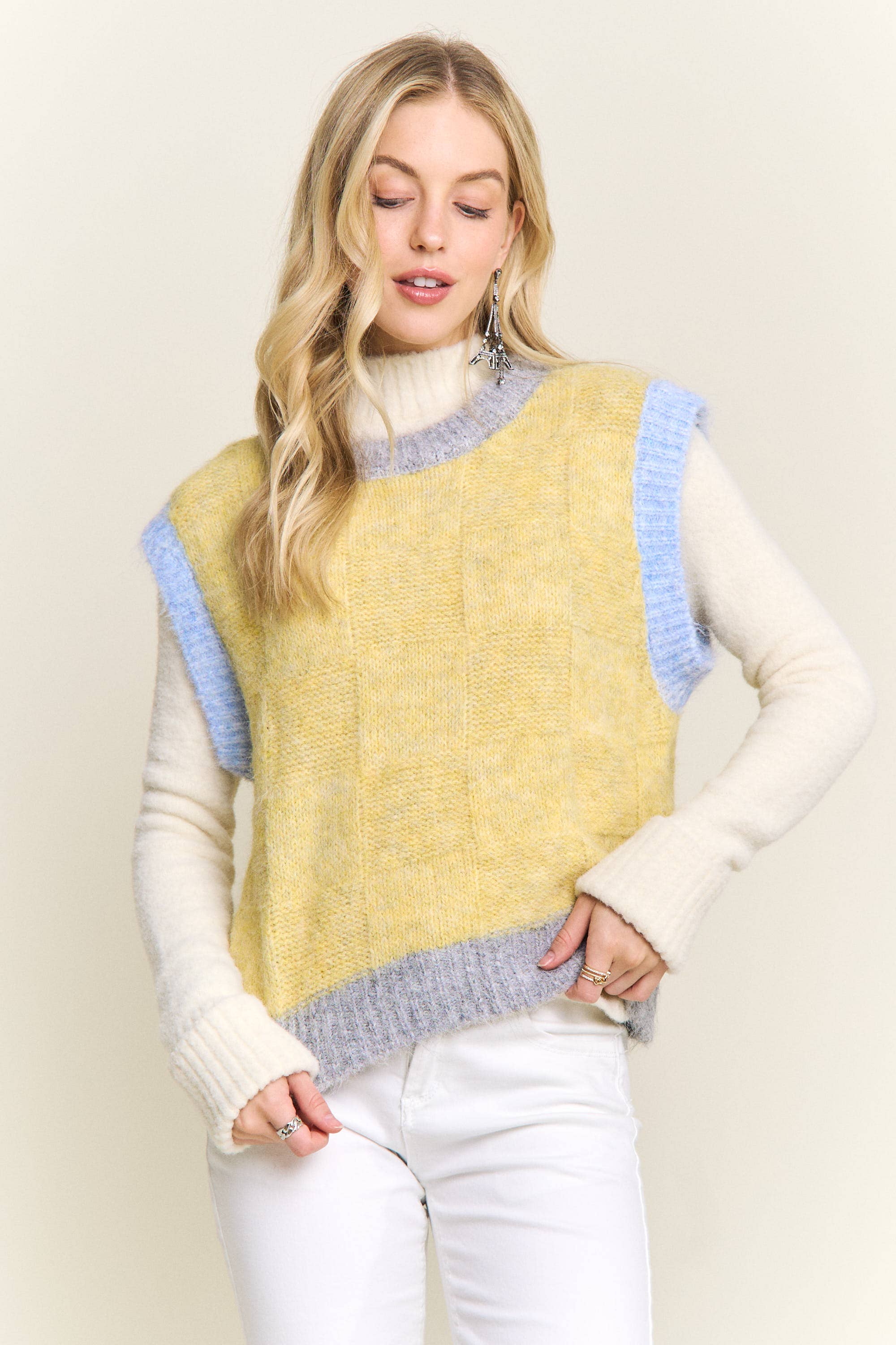 Gilet à carreaux de couleur à col rond en tricot tendance en vente B2B