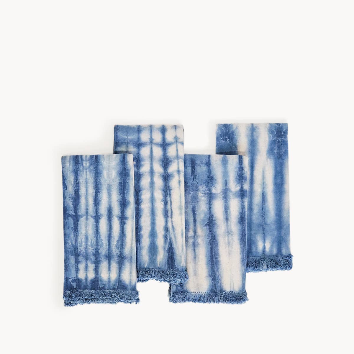 Apportez une touche de magie picturale à votre table avec cet ensemble de 4 serviettes teintes à la main dans des nuances de bleu profond qui se mêlent à des touches de couleurs vives, chacune racontant sa propre histoire colorée unique. 100 % coton, 18 pouces carrés avec des bords frangés. L'ensemble de 4 sera plié, empilé et attaché solidement avec un ruban en sergé de coton. Chaque ensemble de serviettes est accompagné d'un message magique unique sur l'étiquette pour un don et une réception inspirés. Les serviettes illustrées sont un exemple de la variété et de la variation d'une pièce à l'autre — chaque article d'un ensemble sera légèrement différent mais partagera les mêmes couleurs.