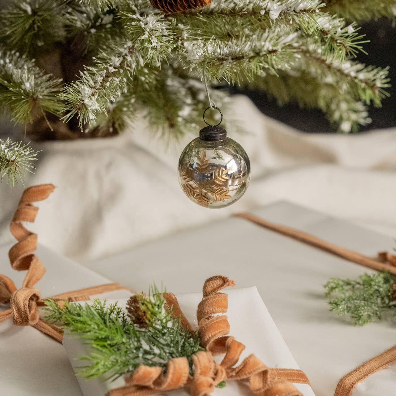 Rehaussez votre décoration de Noël avec notre élégant ornement en forme de flocon de neige d'environ 4 1/2 pouces de diamètre. Délicatement orné d'un slip blanc et estampillé du message sincère : « Lokah Samastah Sukhino Bhavantu », un parfait rappel de paix et de bien-être pour tous les êtres pendant les fêtes.
