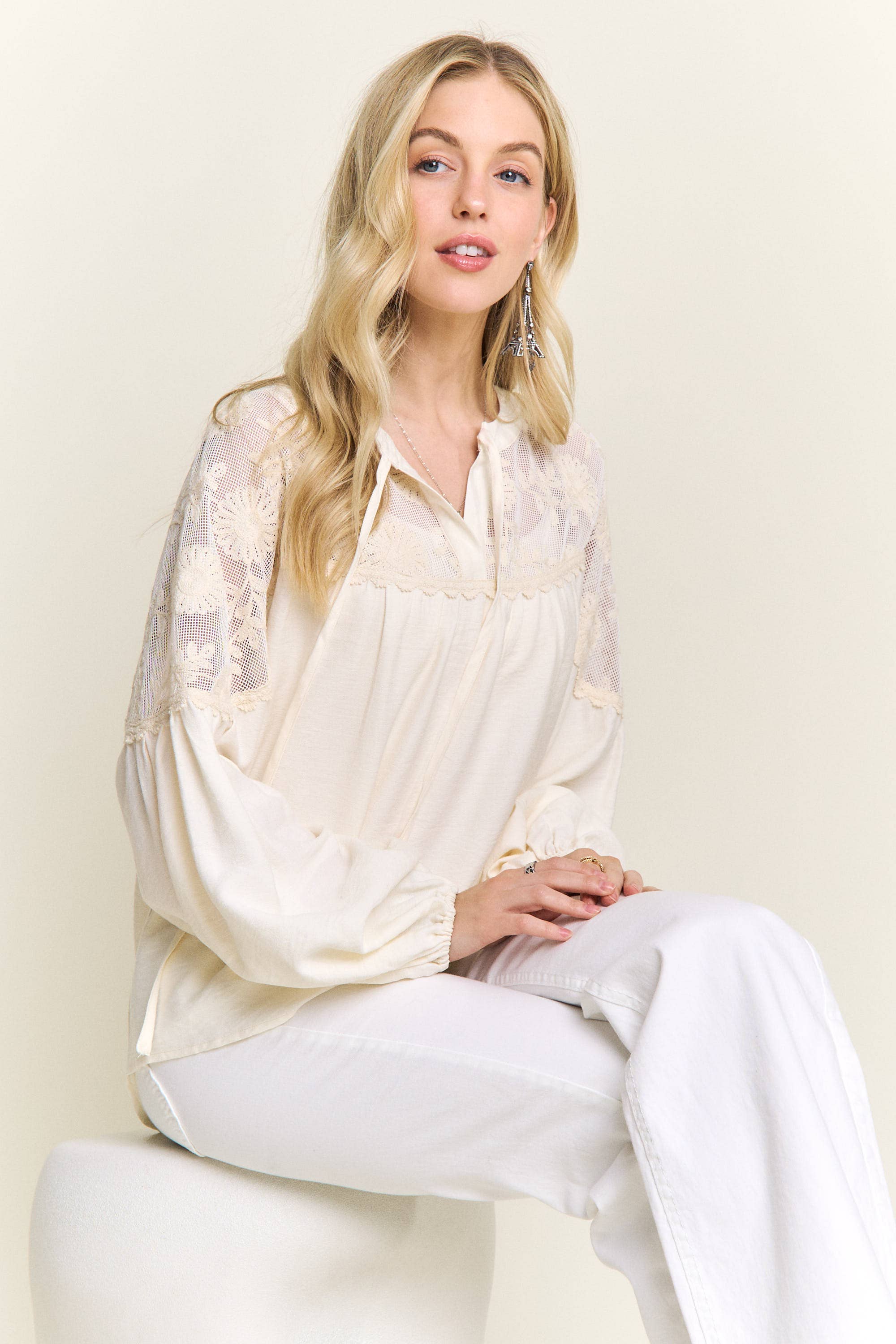 * ED23I36B * Blouse en mousseline brodée avec cordon à nouer * Champagne * Laver à la main à froid avec des couleurs similaires * Séchage à la ligne * 50 % polyester, 50 % viscose * Le mannequin porte la taille S. * Informations sur le modèle : hauteur : 5 pieds 8 pouces, tour de poitrine 32 pouces, taille 24 pouces, hanches 33 pouces