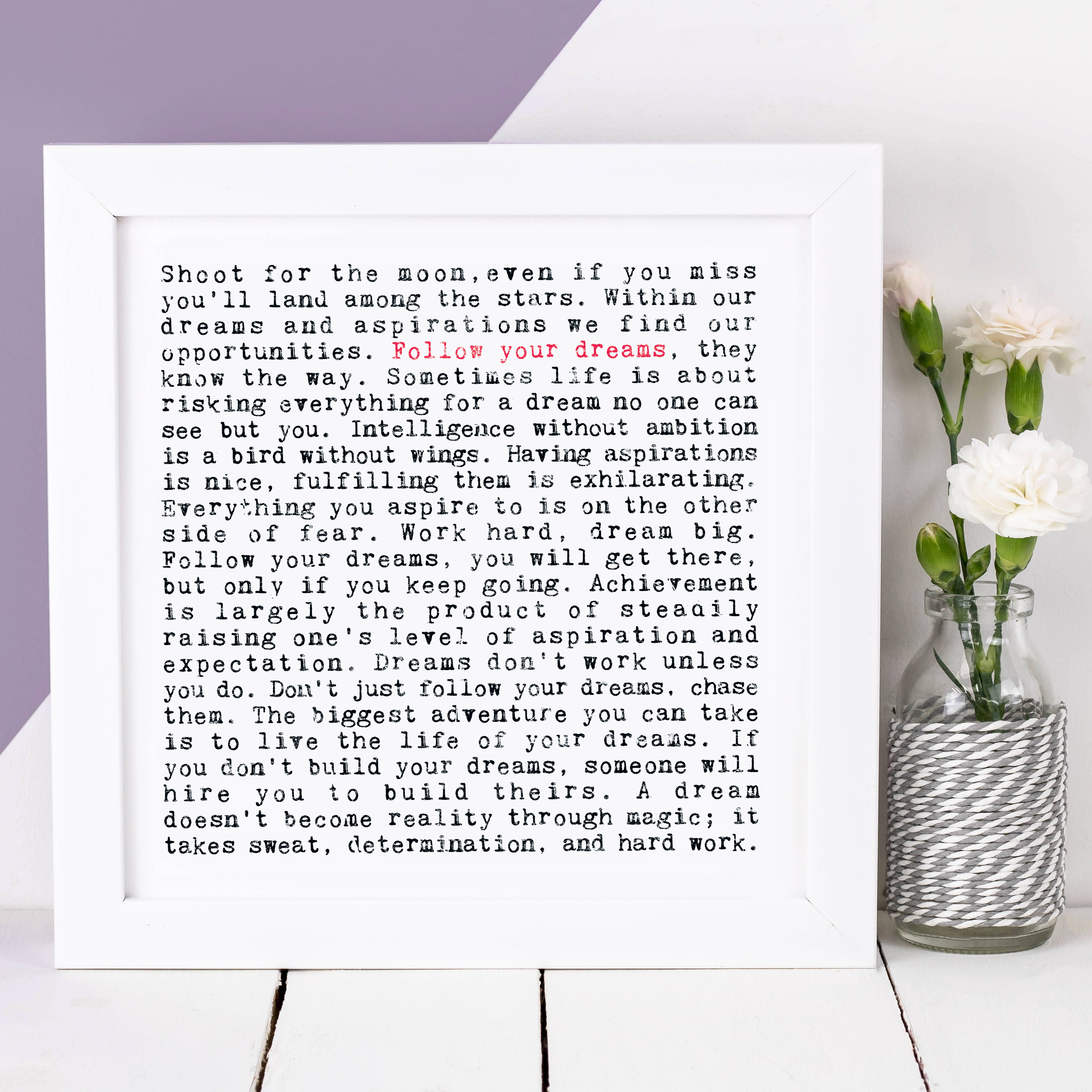 Les guillemets sont écrits dans une police de style machine à écrire vieilli. Imprimé sur du carton texturé épais. Conçu pour s'adapter aux cadres standard. Emballé avec du carton gris recyclé. Imprimé, emballé et expédié depuis le studio Coulson Macleod. Issu de la gamme de produits « Wise Words » la plus vendue de Coulson Macleod.