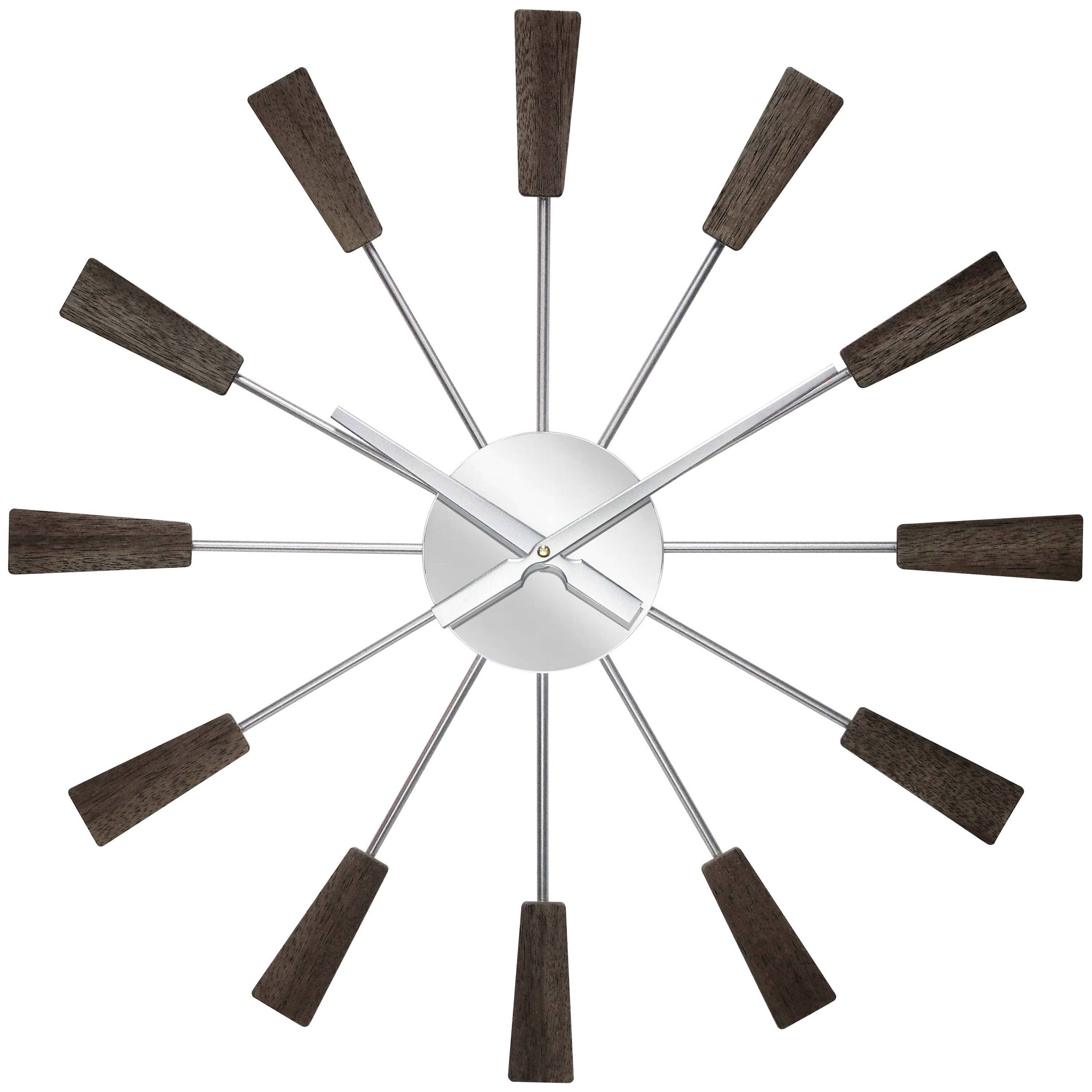 La Satellite d'Infinity Instruments est une horloge murale décorative du milieu du siècle qui ajoute une touche vintage à n'importe quel intérieur. Ses rayons métalliques saisissants, son cadran en aluminium brossé et ses touches de noyer font de cette horloge murale décorative le point central de n'importe quelle pièce. Grâce à son mécanisme de suspension en trou de serrure, le Satellite peut facilement être accroché n'importe où dans la maison. Le mouvement à quartz garantit une heure précise pour les années à venir. Horloge murale Sunburst de 23 po pour une utilisation en intérieur. Mouvement à quartz pour une heure précise. Couvercle en verre sur cadran argenté et aiguilles en métal noir. Utilise 1 pile AA (non incluse). 23 po H x 23 po L x 2 po P.