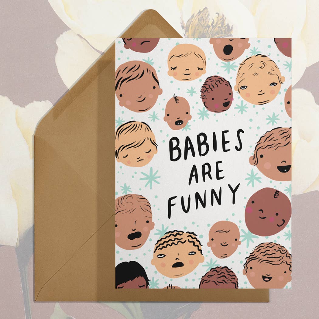 • Carte de vœux A2 (12,1 cm x 14 cm) • imprimée sur papier fin 100# • fabriquée aux États-Unis • enveloppe crème • emballée dans une pochette en cellophane Texte : "C'est un bébé chanceux. // Mille félicitations !"