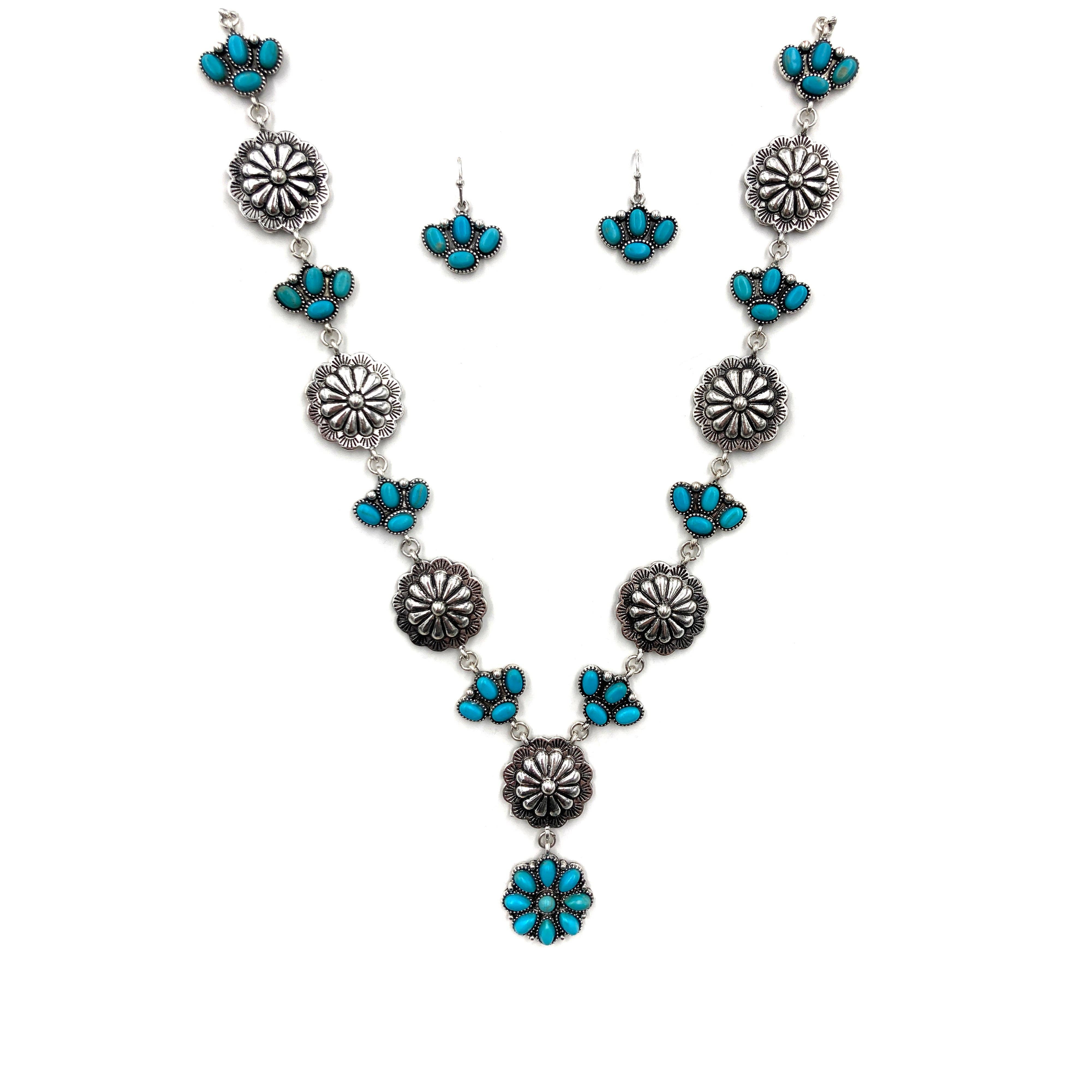 ENSEMBLE COLLIER AVEC PENDENTIF FLORAL OVALE OCCIDENTAL ET BOUCLES D'OREILLES EN FORME DE TIGE, LONGUEUR DU COLLIER : ENVIRON 15 POUCES, TAILLE DE LA BOUCLE D'OREILLE : 1/2 CM ENVIRON La couleur et la qualité du produit telles qu'elles apparaissent sur l'écran peuvent légèrement varier par rapport aux articles réels en raison des conditions d'éclairage de la photographie et de l'étalonnage des couleurs de chaque écran. Veuillez contacter Andrea Bijoux Web pour toute question concernant les détails supplémentaires de l'article ensemble pendentif western, tq, turquoise, floral, pendentif, bijou, collier et boucles d'oreilles,
