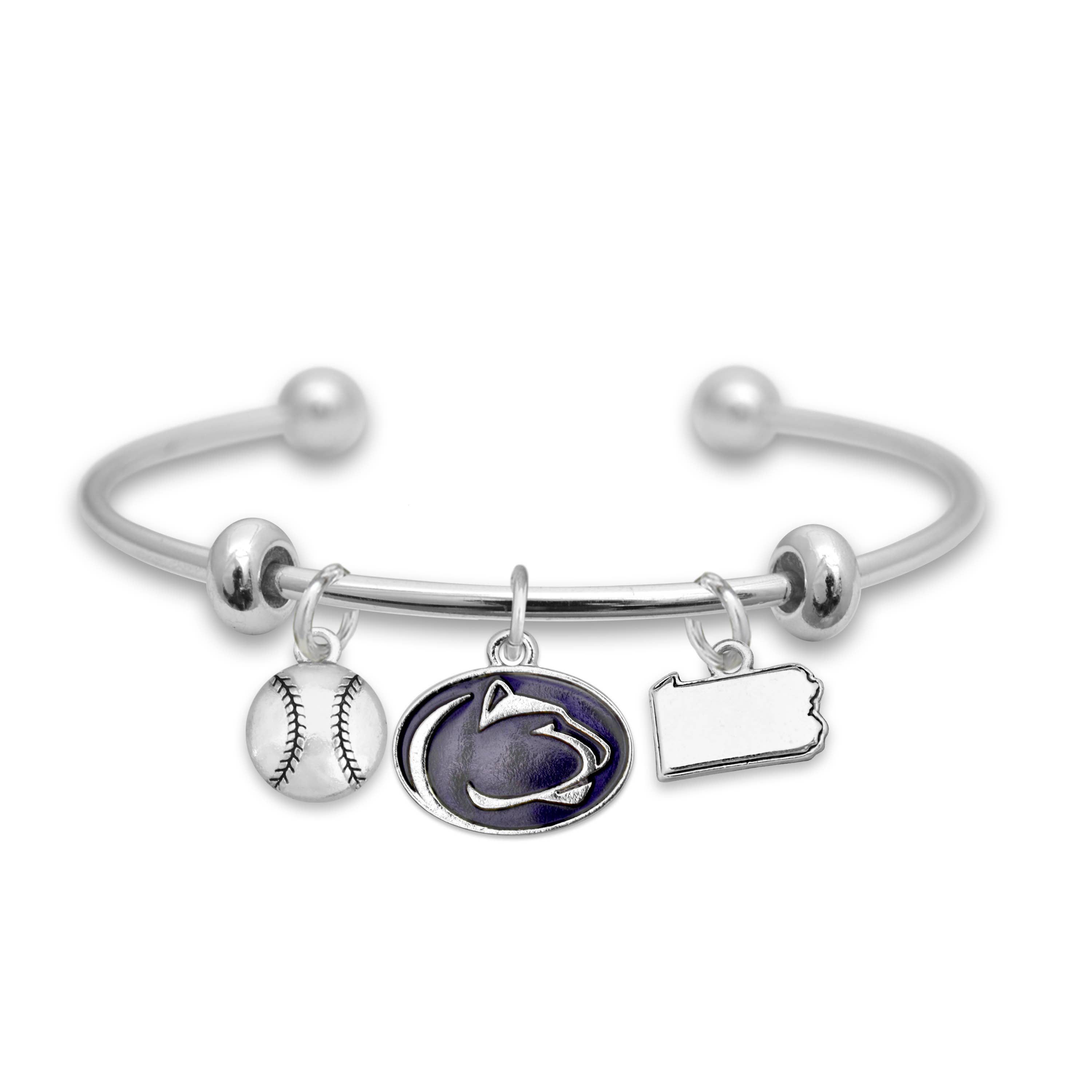 Ce bracelet jonc à trois breloques est orné de trois breloques sur le thème du sport : breloque #1, breloque avec logo couleur de l'équipe, breloque en forme de baseball avec mot-symbole de l'équipe. Le fermoir à tension durable garantit un port sans soucis. Ne craignez donc pas qu'il ne tombe lorsque vous encouragez votre équipe à marquer le home run gagnant.