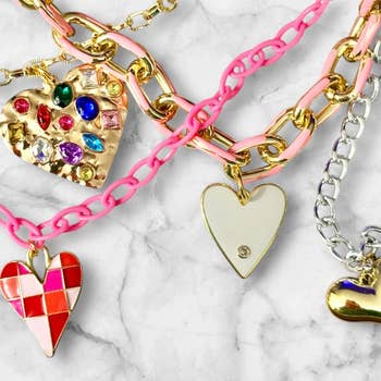 Ce collier charm allie charme et élégance avec une sélection de pendentifs : un nœud, un cœur à damier, un strass scintillant et plusieurs cœurs, tous suspendus à une chaîne fine et raffinée. Le motif à damier apporte une touche audacieuse et tendance, le cœur symbolise l’amour, tandis que le pendentif en strass ajoute une note glamour et brillante. Détails du produit : - Longueur : 43 cm (17 pouces) - Taille des charms : varie de 0,6 cm à 3,2 cm (0,25 à 1,25 pouce) - Extension : chaîne boule de 7,6 cm (3 pouces) - Fermoir : fermoir à pince homard - Finition métal : plaqué or - Conforme sans plomb ni nickel - Protection anti ternissement : double revêtement électronique