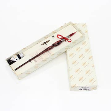 Ces magnifiques stylos en verre soufflé à la main sont amusants et faciles à utiliser. Les stylos en verre conservent l'encre dans les petites mais profondes rainures à la pointe. La pointe équivaut à une plume dans un stylo-plume. Ces rainures retiennent l'encre pendant que vous écrivez. Il suffit de tremper la pointe du stylo dans l'encre et d'écrire. C'est aussi simple que ça. Chaque ensemble est livré dans une belle boîte cadeau noire avec de la mousse pour protéger le verre. Il y a un "coussin" en verre pour reposer votre stylo et un petit flacon d'encre. Les ensembles de stylos sont expédiés par lots de 6 assortis - 2 de chaque couleur : bleu, vert et rouge.