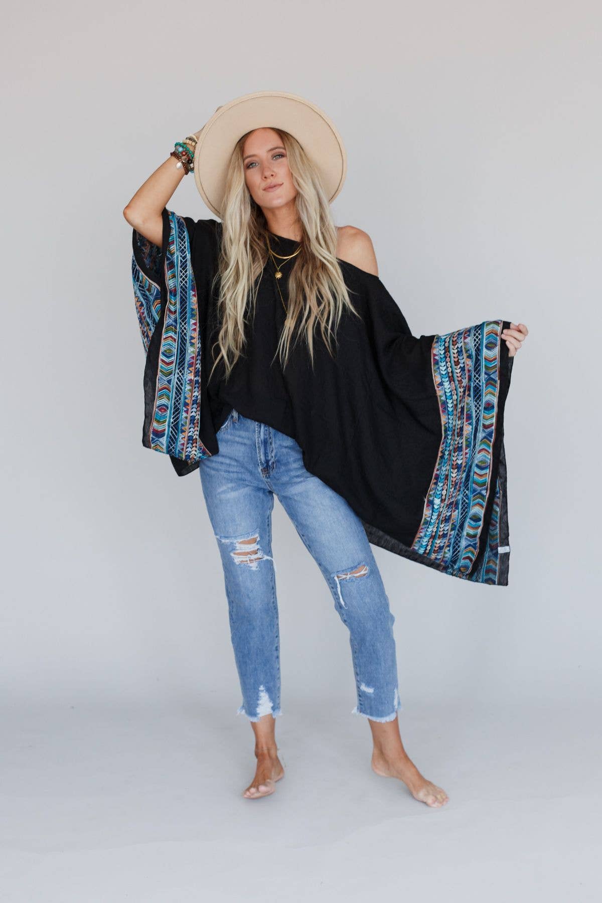 Poncho Coucher de Soleil du Sud-Ouest - vendu par lots de six : 3 petits/moyens & 3 grands/xl Mesures : P/M : Buste 64,8 cm Épaules 41,9 cm Longueur 77,5 cm G/XL : Buste 72,4 cm Épaules 44,5 cm Longueur 81,3 cm