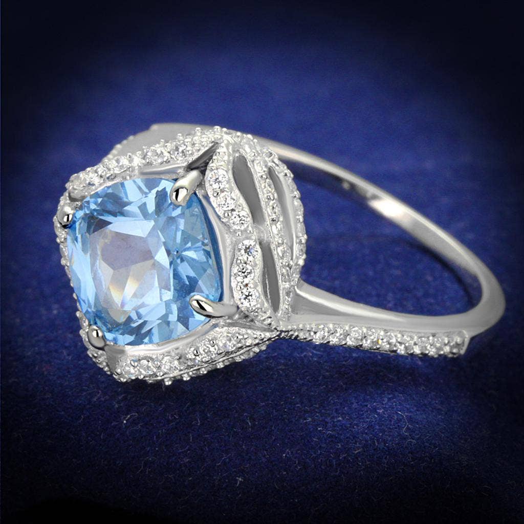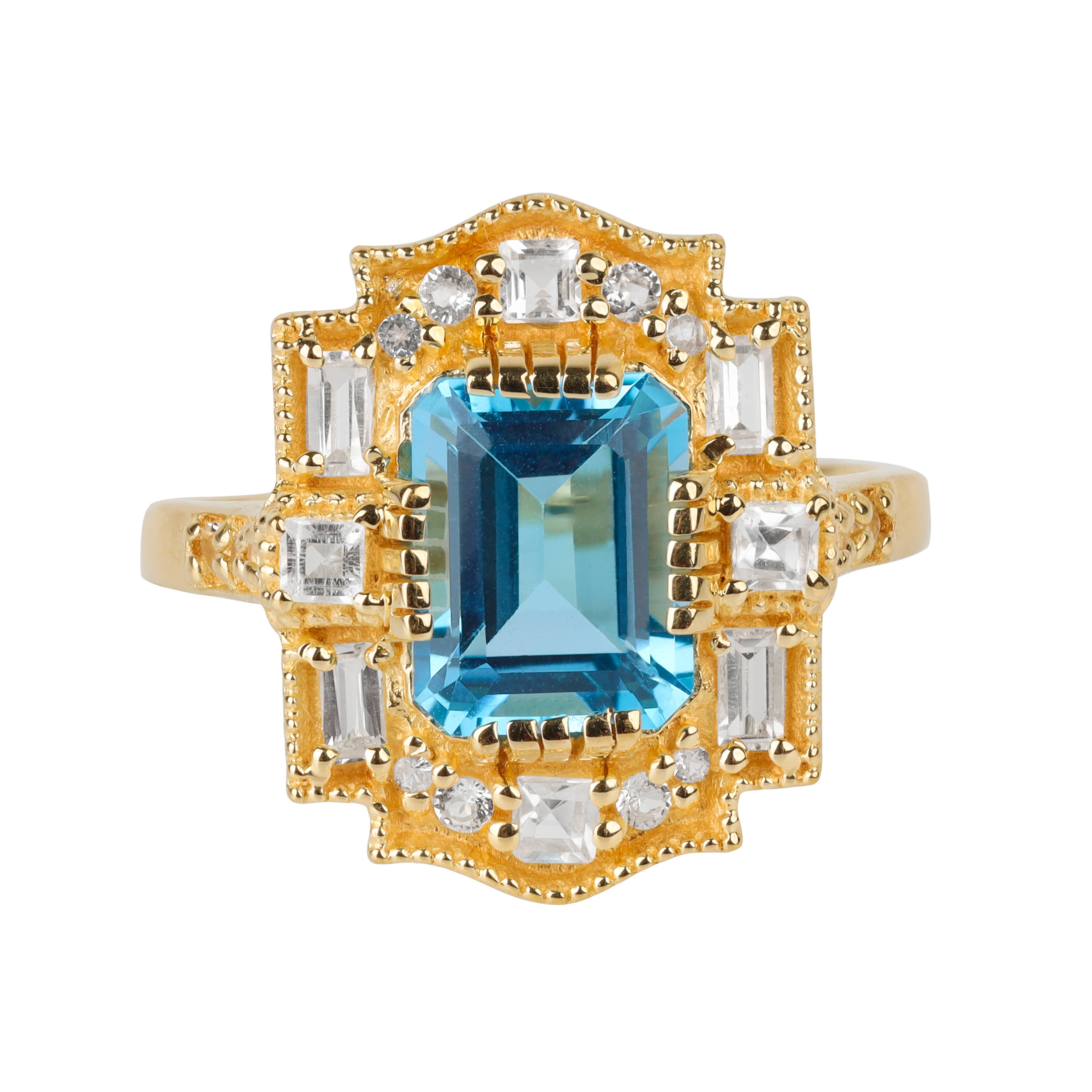 Bague en argent sterling 925 ornée de diamants et d'une topaze bleue en forme d'émeraude de 8 x 6 mm (couleur I-J, pureté I2-I3). Complétez vos ensembles habillés avec cette magnifique bague de cocktail en argent sterling 925. La sophistication durable de la taille émeraude brille dans cette séduisante bague ornée d'une topaze bleue de 8 x 6 mm sertie de griffes, auréolée d'une bordure ornée de diamants et de perles. La tige fendue de la bague est également perlée, ce qui ajoute de la texture et de la dimension au look qui définit le charme élégant. Ces diamants ronds sont d'une couleur I-J et d'une clarté I2-I3 approximatives. La topaze bleue est la pierre de naissance traditionnelle du mois de décembre, ce qui fait de cette bague tendance envoûtante le cadeau idéal pour les anniversaires, les fêtes ou les anniversaires. Dimensions totales : 7 x 18 x 25. Poids en grammes du produit : 5,8.