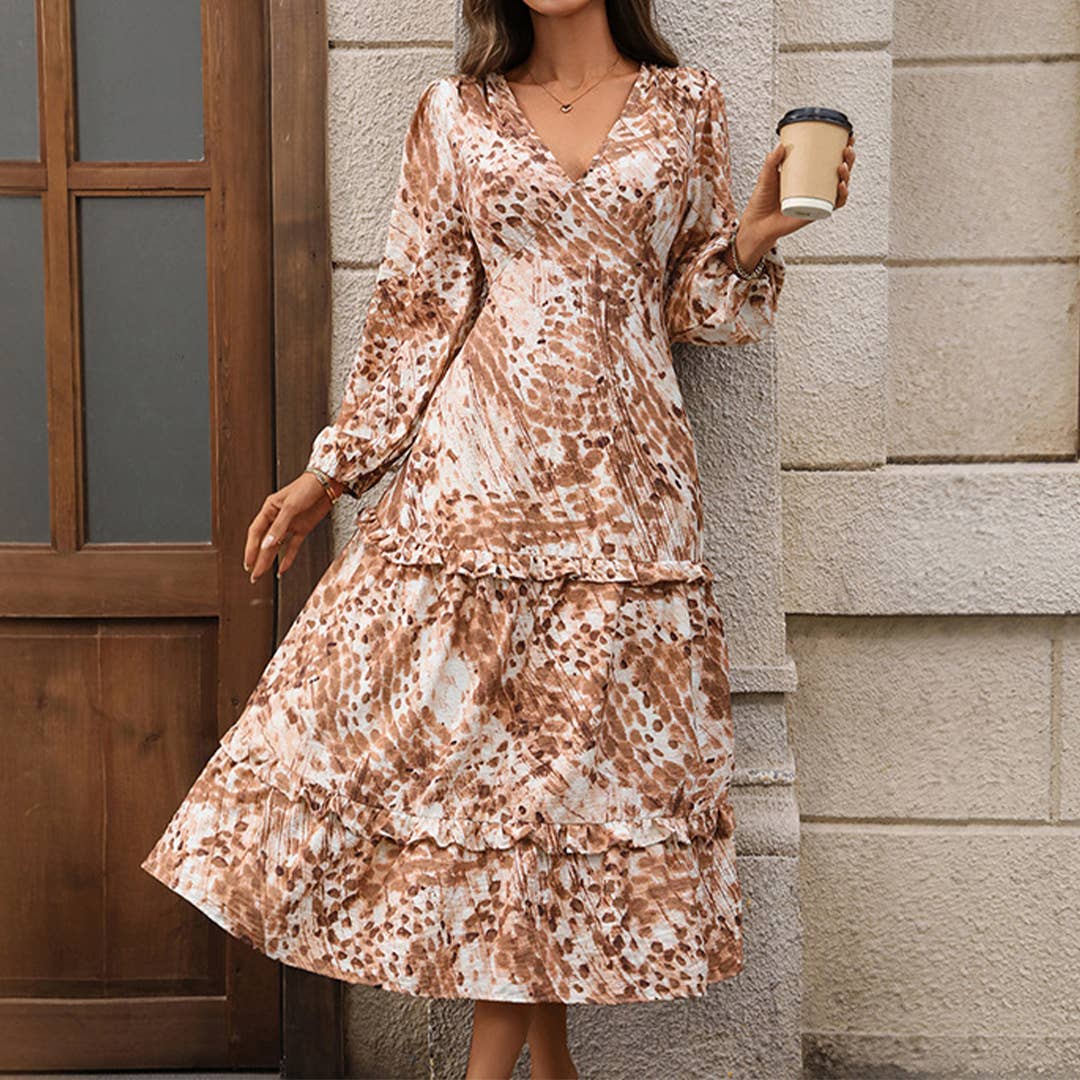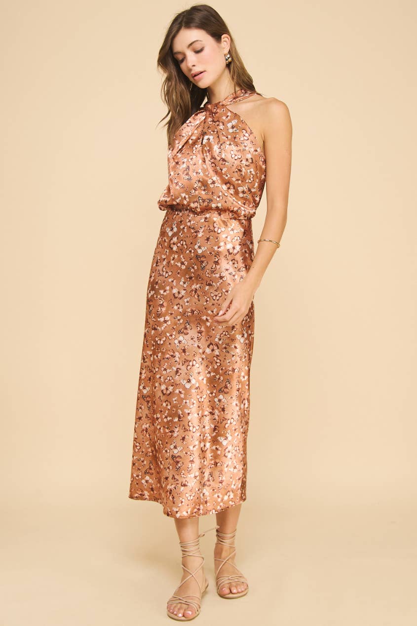 - Fabriqué aux États-Unis - Satin imprimé - Col en V - Poches latérales - Longueur mi-mollet - Le mannequin porte la taille S