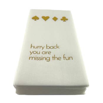 Chaque lot de 24 serviettes jetables en forme de tissu avec un message gaufré en aluminium qui offre un effet typographique riche, plusieurs fois supérieur à celui d'une serviette à cocktail en papier ordinaire. Améliorez votre hébergement ou offrez-le à votre hôtesse préférée pour ajouter un style chic et amusant. Nos modèles en stock sont prêts à être expédiés immédiatement. Si vous souhaitez passer une commande personnalisée (avec un minimum de 24 jeux par message/couleur), veuillez nous en informer. Si vous en rêvez, nous pouvons le concevoir, rien que pour vous.
