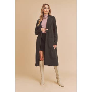 Ce trench-coat en maille se distingue par son col à revers, sa ceinture assortie, ses manches longues et larges, ses fentes latérales ainsi que ses poches en biais. Sa coupe oversize offre un style décontracté et élégant. - Le mannequin mesure 1,75 m et porte une taille Small.