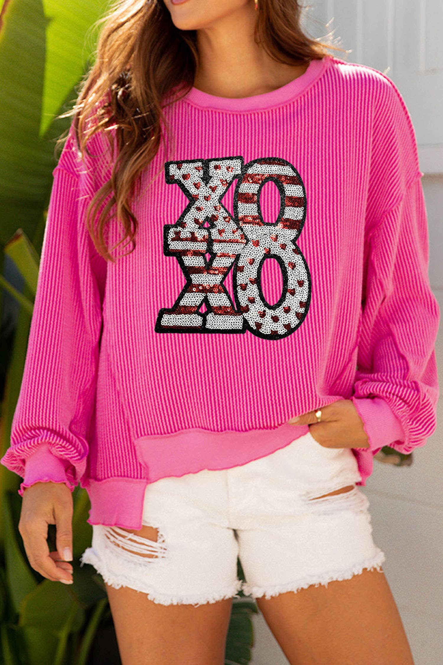 Sweatshirt Doux en Chenille XOXO * Marque privée, sweatshirt doux. La composition des fibres peut légèrement varier selon la disponibilité. * Le sweatshirt en chenille douce avec patch lettre présente XOXO dans un mélange de Saint-Valentin, en ligne droite. Ce haut tendance est parfait pour la Saint-Valentin. * Indication de taille : Il s'agit d'un sweatshirt unisexe basique, qui taille normalement. Voir les images supplémentaires pour les tableaux de tailles. * Instructions d'entretien : Il est recommandé de laver à la main et de sécher à l'air libre uniquement. * Le mélange de Saint-Valentin inclut des lettres rouges, blanches, rose vif et rose clair. La couleur et la séquence des lettres en chenille douce peuvent varier par rapport aux photos du produit. Rafraîchissez votre garde-robe pour la saison de la Saint-Valentin à venir !