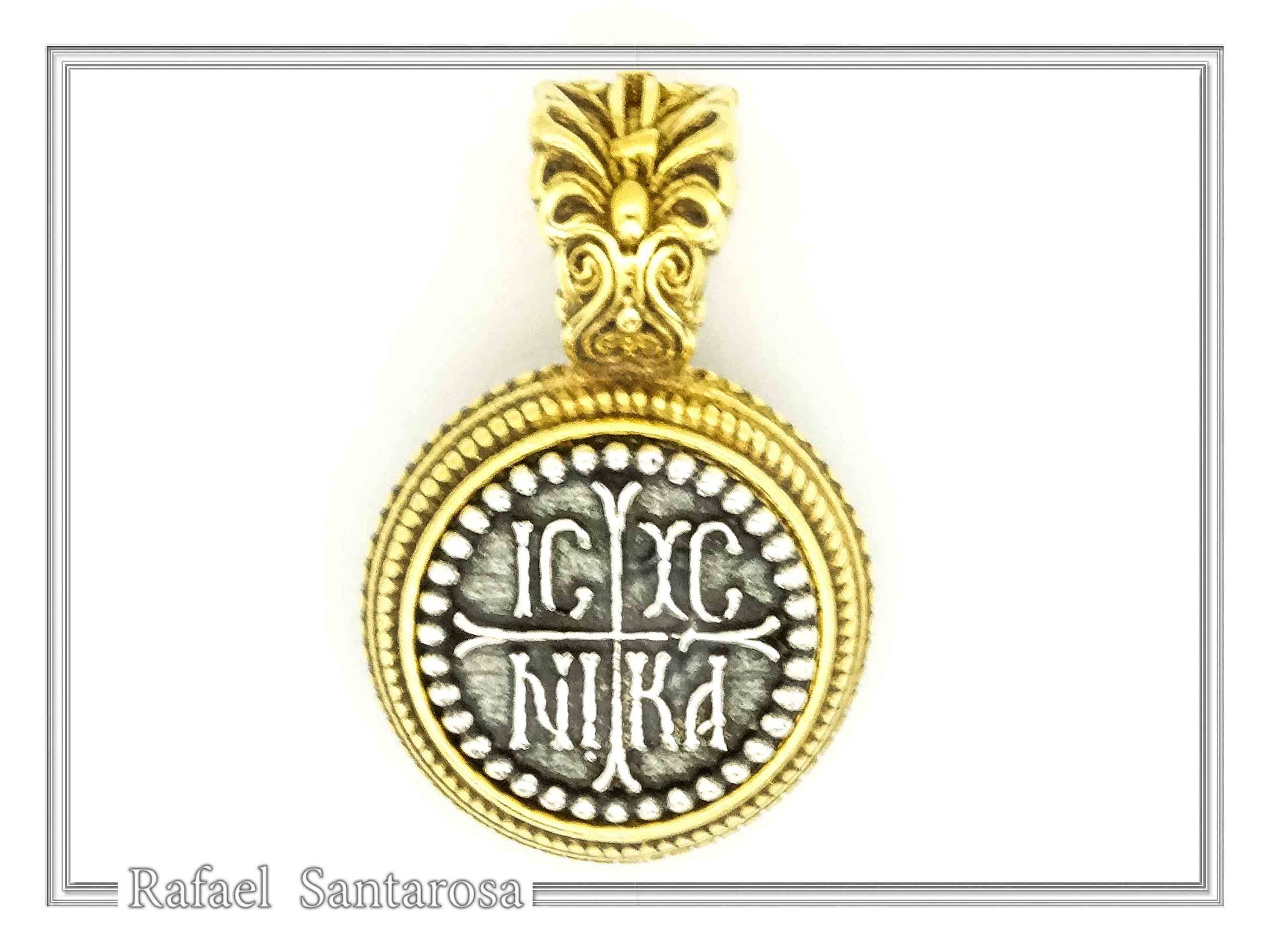Collier talisman chrétien de protection Jésus Christ Pendentif Christogramme sur argent sterling oxydé en forme de pièce de monnaie. Réplique de breloque Constantinato. Pendentif symbole Jesus Crist sur argent sterling oxydé en forme de pièce de monnaie encadré dans une base en argent plaqué or. Un pendentif conçu par Rafael Santarosa basé sur le symbole apotropaïque au nom de Jesus Crist. C'est l'abréviation du nom « Jesus Crist » qui vient de la tradition religieuse byzantine. Le prototype écrit en lettres byzantines était I XP et ils le disaient comme une prière, et pour le mettre à nu comme bouclier de protection contre le mal.