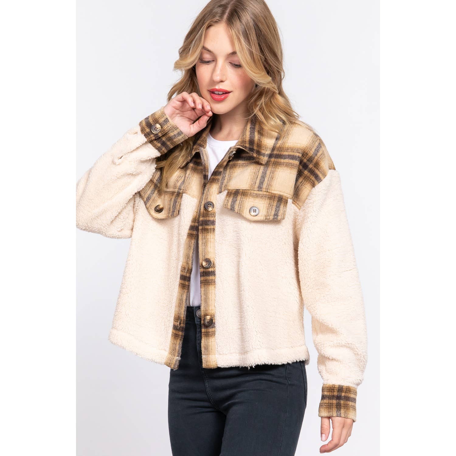 * Numéro de style : JM2013255 Contenu du tissu TISSU : PLAID BROSSÉ 95 % POLYESTER 5 % LAINE Descriptif VESTE COURTE SURDIMENSIONNÉE BOUTONNÉE À CARREAUX EN LAINE MÉLANGÉE À MANCHES LONGUES