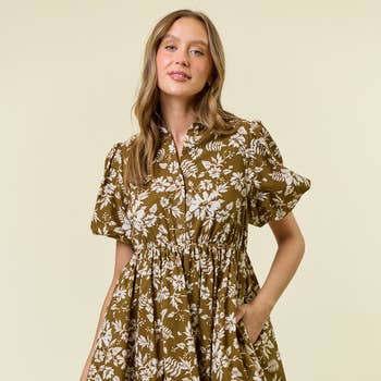 Robe en satin imprimé avec boutons en coquillage sur le devant, lien à nouer à l'avant et manches longues avec poignets boutonnés.