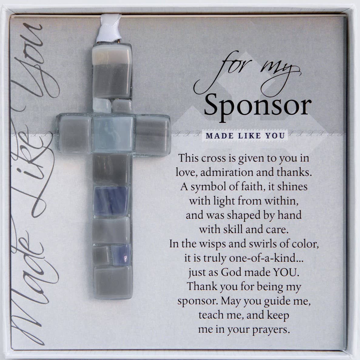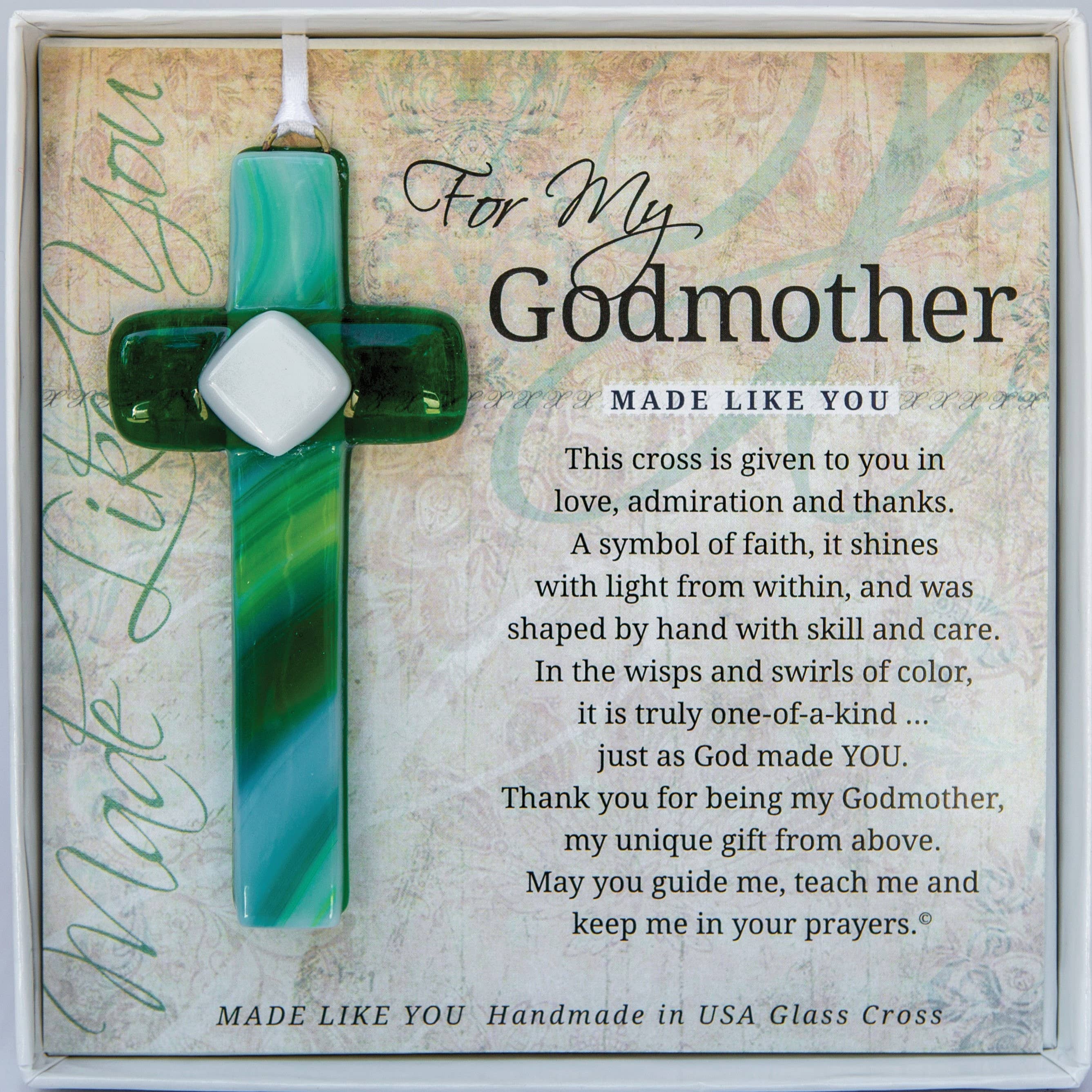 Un cadeau souvenir vraiment unique pour un filleul. Notre croix en verre mosaïque est fabriquée à la main aux États-Unis et est un mélange de nuances de verre transparent et bleu. Chaque croix est fabriquée de manière unique, tout comme votre filleul l'est de manière unique et merveilleuse ! Cette croix de 4 pouces est suspendue à un ruban de satin blanc, parfaite pour être exposée toute l'année ou comme trésor annuel sur un sapin de Noël. Offrez ce cadeau spécial au filleul le jour du baptême ou du baptême de votre bébé ou tout autre jour où vous souhaitez montrer votre amour. La croix est très agréable à porter et est emballée dans une boîte cadeau blanche de 5,5 x 5,5 avec un couvercle transparent. Un cadeau de baptême ou de baptême mémorable pour votre filleul.