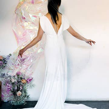 C'est un voile ! C'est un nœud ! C'est... absolument magnifique. Confectionné en organza 100 % pur éco-soie, une soie récoltée de manière durable par des travailleurs rémunérés équitablement, notre Foulard Emma avec nœud et voile est une pièce luxueusement élégante qui sublimera votre tenue de mariage. Bien sûr, la longueur peut être personnalisée selon vos souhaits. Conçu et fabriqué à la main avec amour à Toronto par Antonia de The Loved One. • Couleur : ivoire (autres couleurs disponibles sur commande spéciale) • Taille : voile - 203 cm (80 pouces) de long ; nœud - 64 cm (25 pouces) de large (personnalisables sur demande) • Matériaux : organza 100 % éco-soie, peigne à cheveux en métal