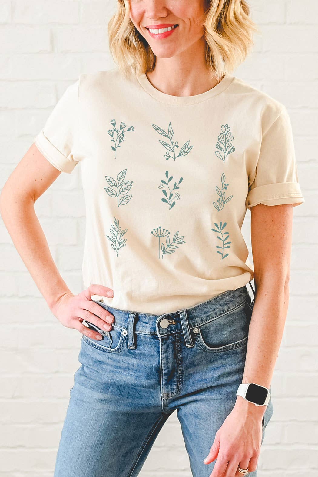 T-shirt muscle femme à manches retroussées avec motif feuilles de fougère forêt, bleu sarcelle profond en vente B2B