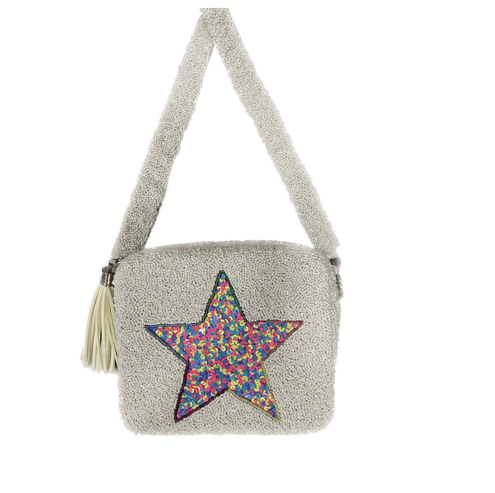 Sac à main à bandoulière en forme d'étoile multicolore blanc entièrement perlé pour femme