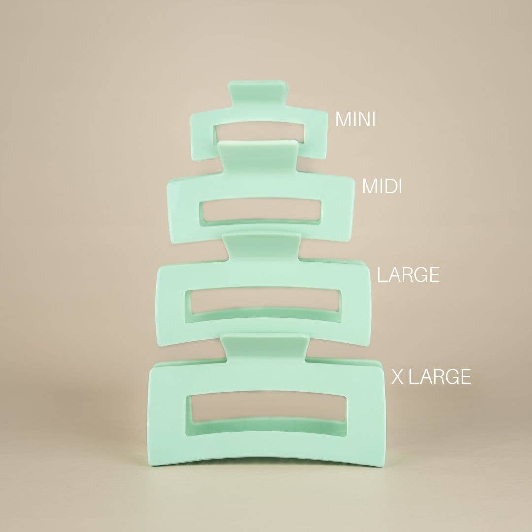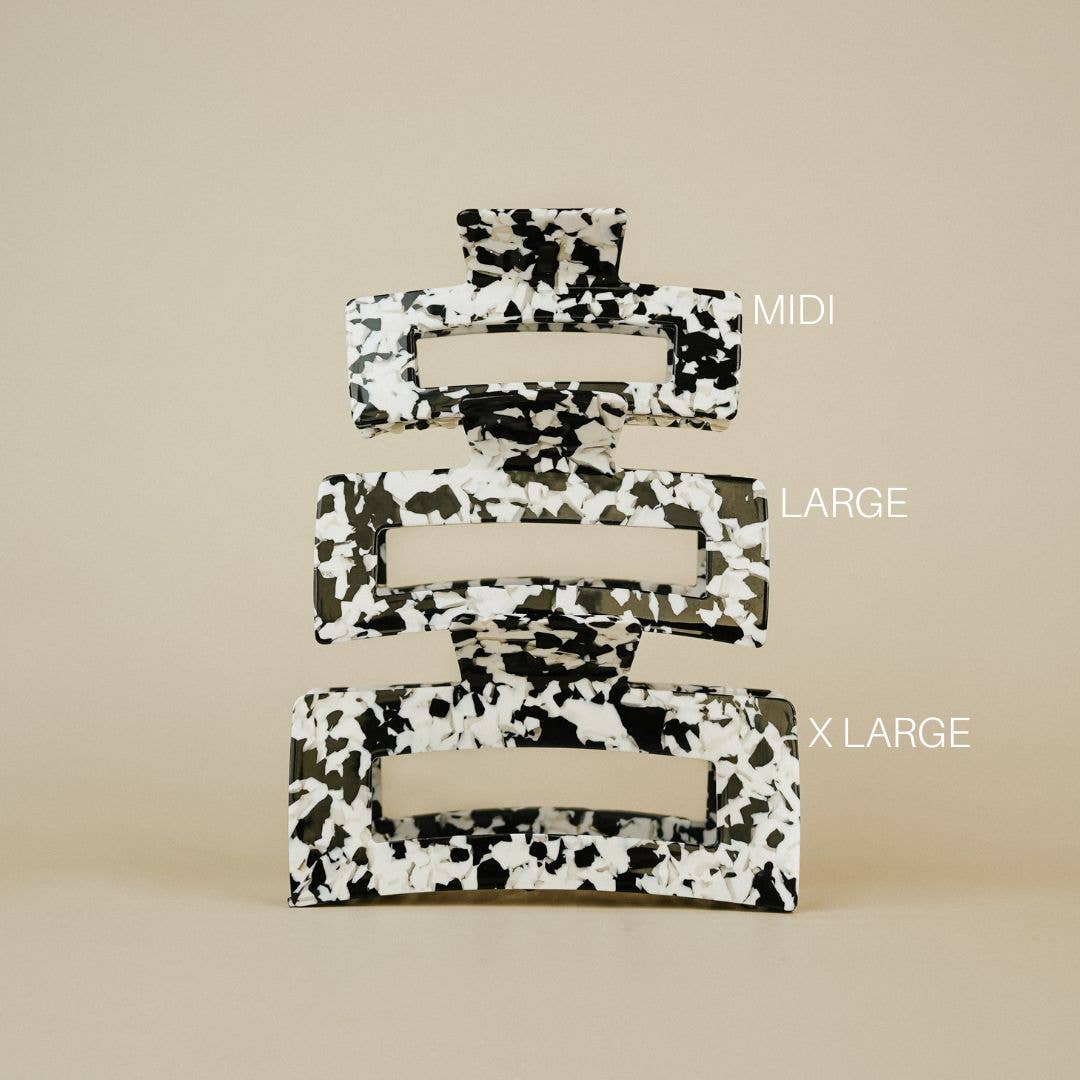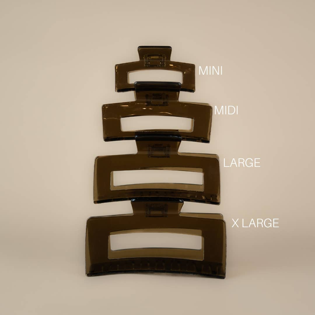 Prix de détail suggéré : Mini 20$, midi 22$, grand 24$, X-Large 26$ Disponible en plusieurs tailles pour couvrir tout le spectre de l'épaisseur, de la longueur et de la texture des cheveux, la difficulté de trouver une pince qui maintient réellement vos cheveux en place est terminée. - Le design intemporel est à la fois chic et fonctionnel : soutient sans effort les cheveux tout au long de la journée et jusque tard dans la soirée - La forme carrée garantit que les dents restent à plat et ne pénètrent pas dans l'arrière de la tête - Recul exceptionnel du ressort pour un maintien sûr et sans bougeage - Le matériau en acétate de cellulose est de haute qualité, extrêmement durable et résistant à la rupture Mini, 7 cm, idéal pour les cheveux courts et fins Midi, 10,5 cm : idéal pour les cheveux courts à mi-longs, quelle que soit leur épaisseur et leur texture Grand, 12 cm, idéal pour les cheveux longs, épais et texturés XL, 13 cm, idéal pour les cheveux longs, très épais et ultra texturés * N'apportez pas les clips dans des endroits très chauds (par exemple, un sauna) et soyez prudent lorsque vous les portez par temps très chaud en plein soleil. Une chaleur élevée peut altérer la forme !