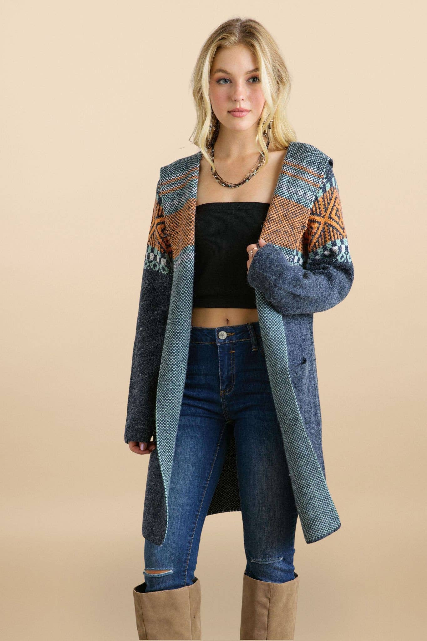 Nativo présente le AMC06, un cardigan classique à manches longues pour femme. Reflétant notre esprit design du Sud-Ouest, cette pièce apporte une touche du charme du Nouveau-Mexique à votre garde-robe. Polyvalent, il s’associe facilement à toutes vos tenues, alliant confort et élégance. Parfait pour les soirées fraîches ou les environnements de bureau. Adoptez l’esprit Nativo avec ce tricot essentiel.