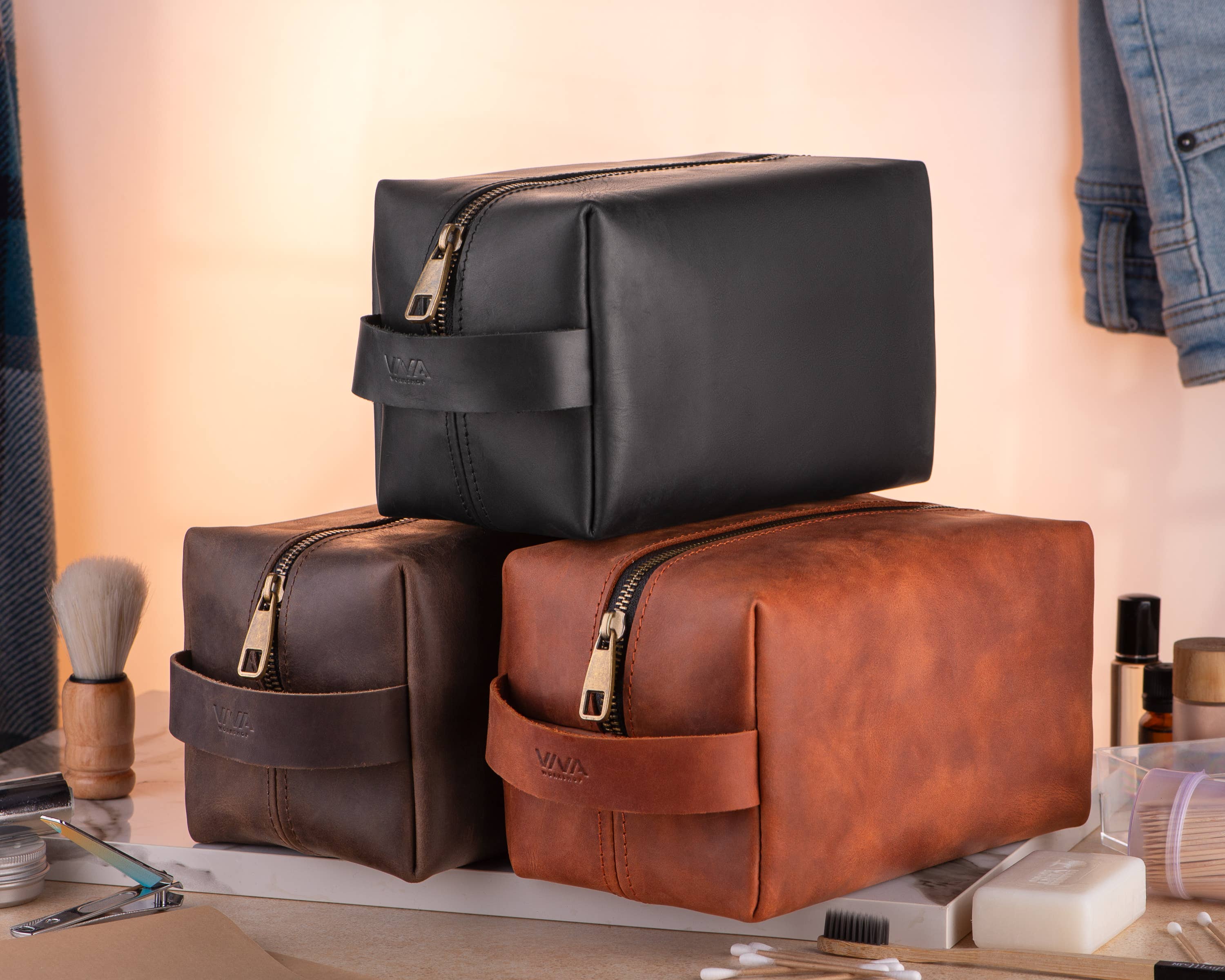 Trousse de toilette en cuir pleine fleur - Fabriquée aux USA en vente B2B