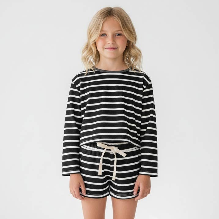 Pour les esprits aventureux, notre ensemble Born to Ride est le choix parfait ! Avec un imprimé moto cool, cet ensemble est conçu pour ceux qui aiment un peu de caractère dans leur style. Doux, respirant et fait pour les journées actives, cet ensemble les gardera à l'aise tout en affichant leur personnalité audacieuse. * Tissu Premium : Notre coton soyeux signature, apprécié par les clients pour sa douceur, sa respirabilité et sa forme durable * Composition du Tissu : 95 % coton, 5 % élasthanne pour une sensation douce et extensible qui bouge avec eux * Coupe : Conforme à la taille avec une coupe ample et décontractée * Shorts Confortables : Taille entièrement élastique pour un port facile, un ajustement sûr et un confort tout au long de la journée * Haut Décontracté : Conçu avec une coupe ample et décontractée pour un confort ultime et une liberté de mouvement * Faux Cordon de Serrage : Un détail élégant à la taille sans encombrement supplémentaire. * Tenue Quotidienne : Parfait pour se détendre, les rendez-vous de jeu ou les sorties décontractées * Instructions d'Entretien : Lavage à froid avec des couleurs similaires, séchage en machine à basse température ou séchage à l'air libre