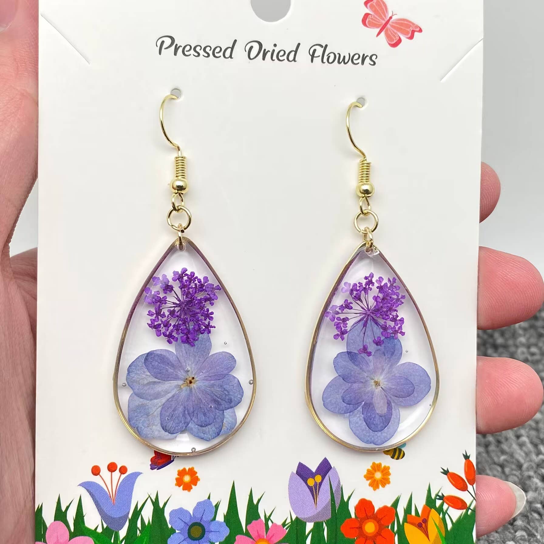 Apportez chez vous le style cottage frais avec ces bijoux authentiques en fleurs pressées ! Ces grandes boucles d'oreilles papillon en métal doré présentent des fleurs séchées roses, jaunes, bleues et rouges, encastrées dans de la résine claire sur des crochets d'or. Un design naturel et vintage avec des fleurs séchées multicolores. • Fabriqué en Chine • Collier en fleurs pressées authentiques, monté en or • Design papillon inspiré du jardin • Dimensions : 5 x 3,2 cm • Matériaux : métal à ton doré, acrylique, fleurs séchées authentiques
