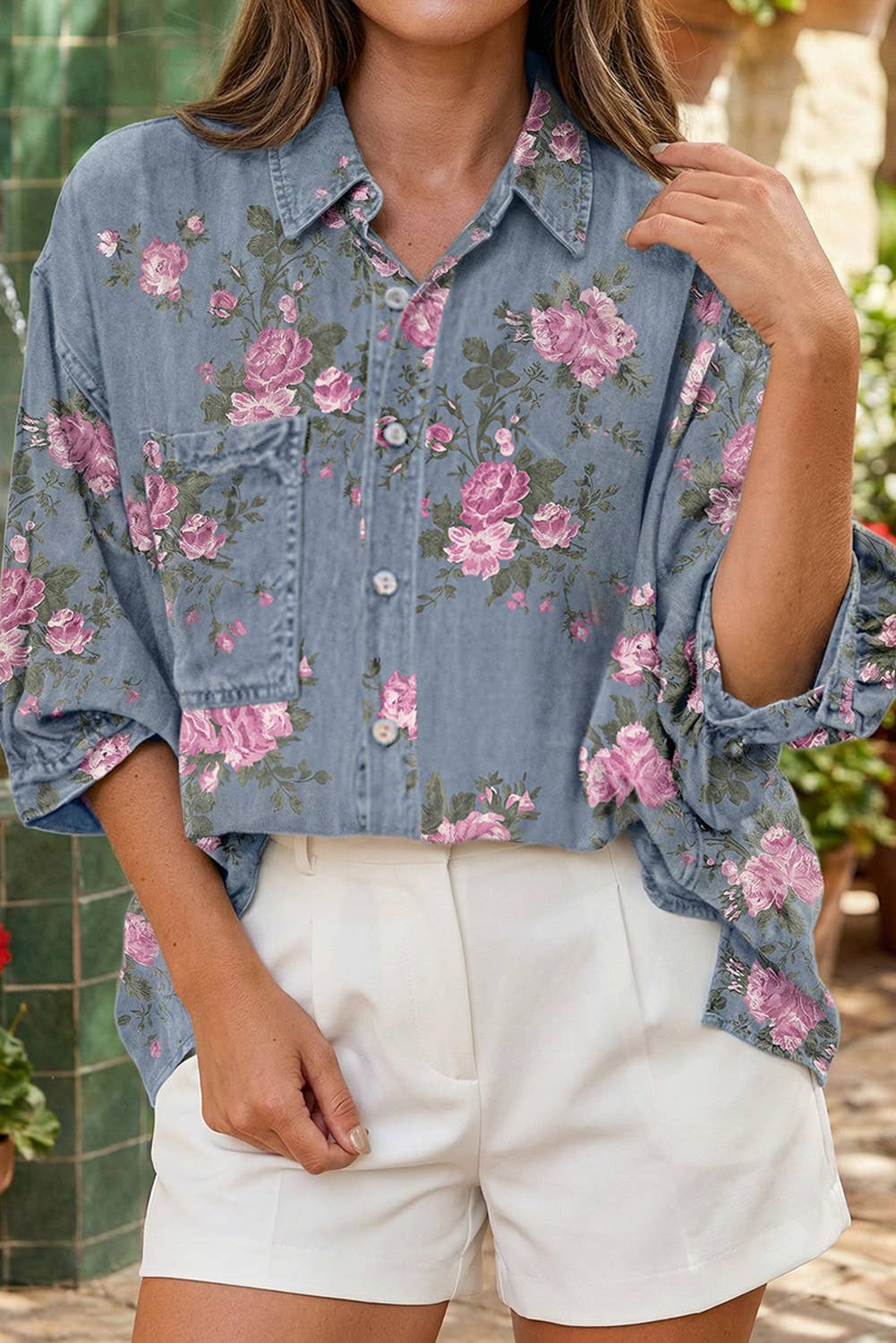 - Design romantique : Imprimé floral doux sur un tissu léger et aéré pour une sensation fraîche et féminine. - Manches à volants : Manches à volants superposées gracieuses ajoutant une silhouette charmante et ludique. - Col mandarin : Col mandarin élégant avec un devant partiellement boutonné pour un look soigné. - Coupe décontractée : Design fluide et confortable parfait pour le temps chaud. - Ourlet incurvé : Ourlet subtilement incurvé pour une finition flatteuse qui se porte bien rentré ou non. - Le mannequin mesure 1,75 m, 81-58-89 et porte une taille S Cette blouse florale vibrante offre une touche légère et élégante à votre garde-robe d'été. Associez-la à un short en jean pour une journée décontractée ou à un pantalon ajusté pour un look raffiné.