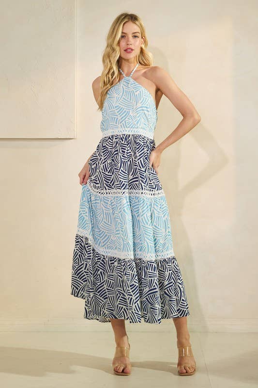 Robe longue boutonnée sans manches à rayures bleues Boho BFZY994 en vente B2B