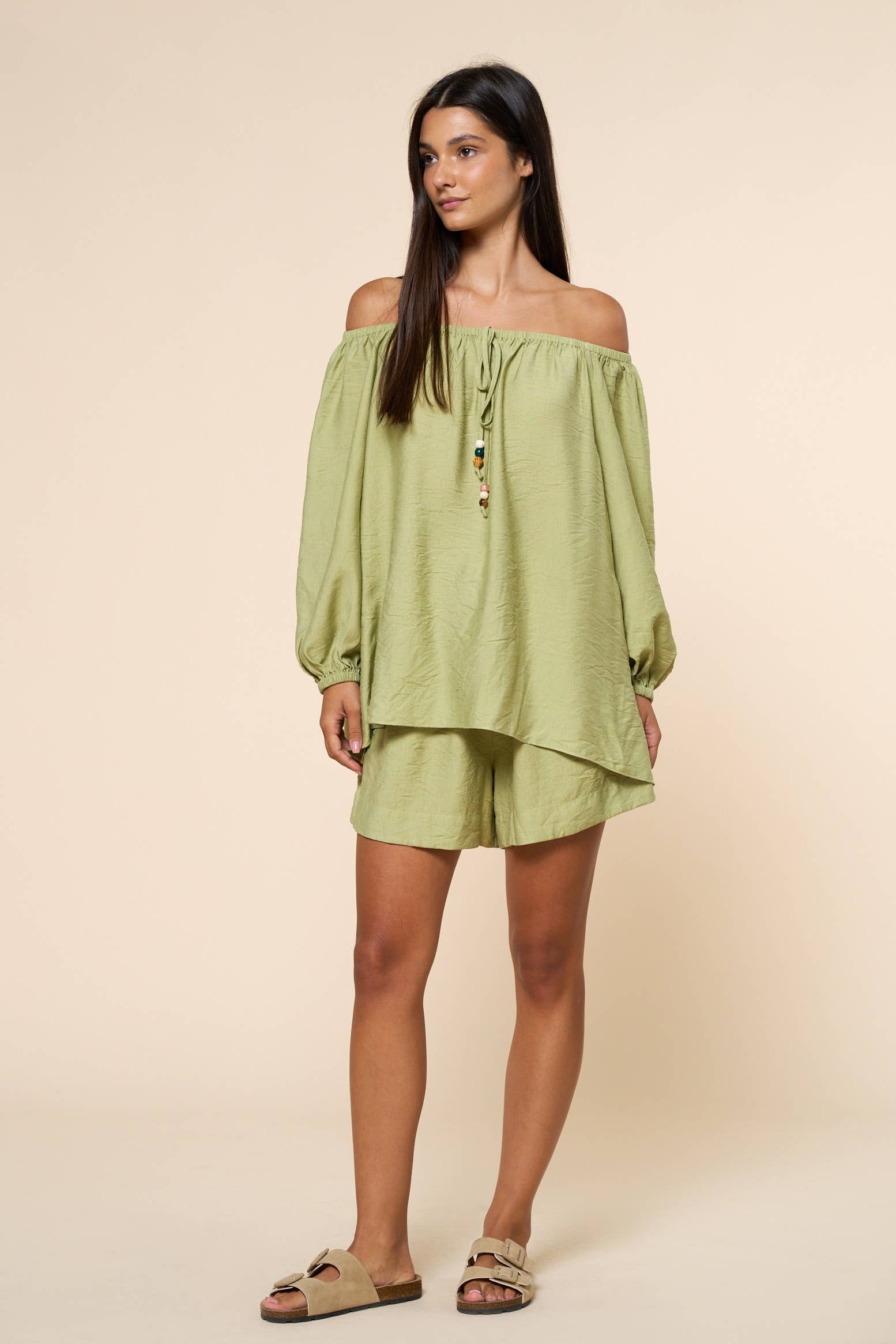 * Style n° : TP10258 - Tissu en gaze douce avec détails brodés - Bande smockée sur la poitrine - Haut court babydoll - Encolure carrée avec manches longues bouffantes - Bande élastique à l'ouverture des manches - Évasé sur le panneau inférieur du corps - Le modèle en gris chiné mesure 1,73 m, 81-58-86 et porte une taille Small Disponible par CARAMEL : 27/02/2026 OLIVE : 27/02/2026